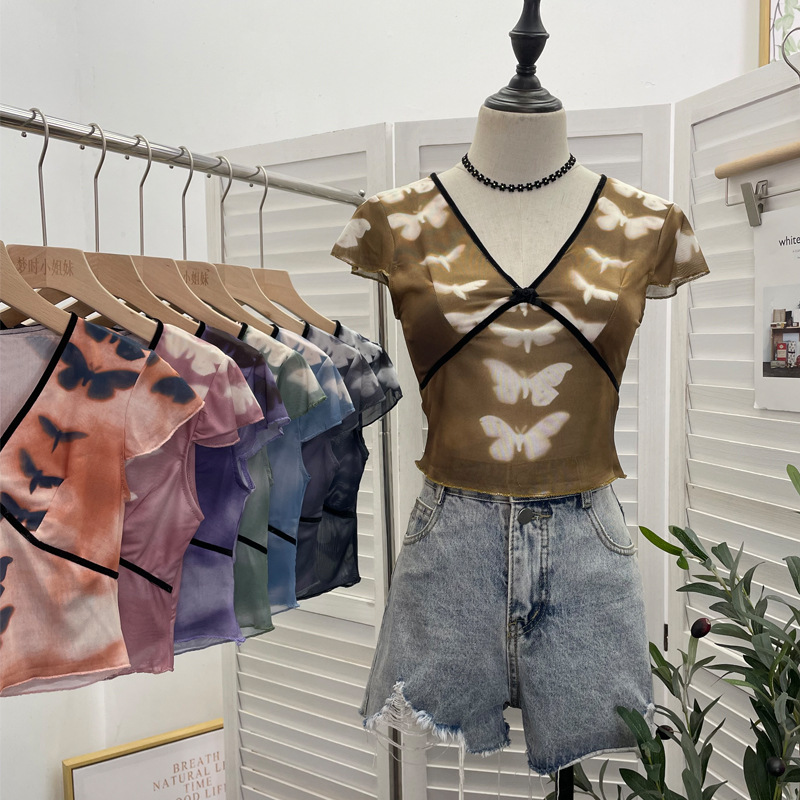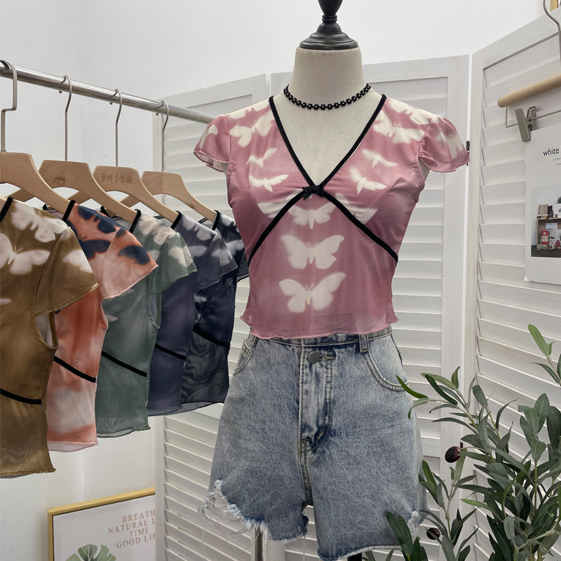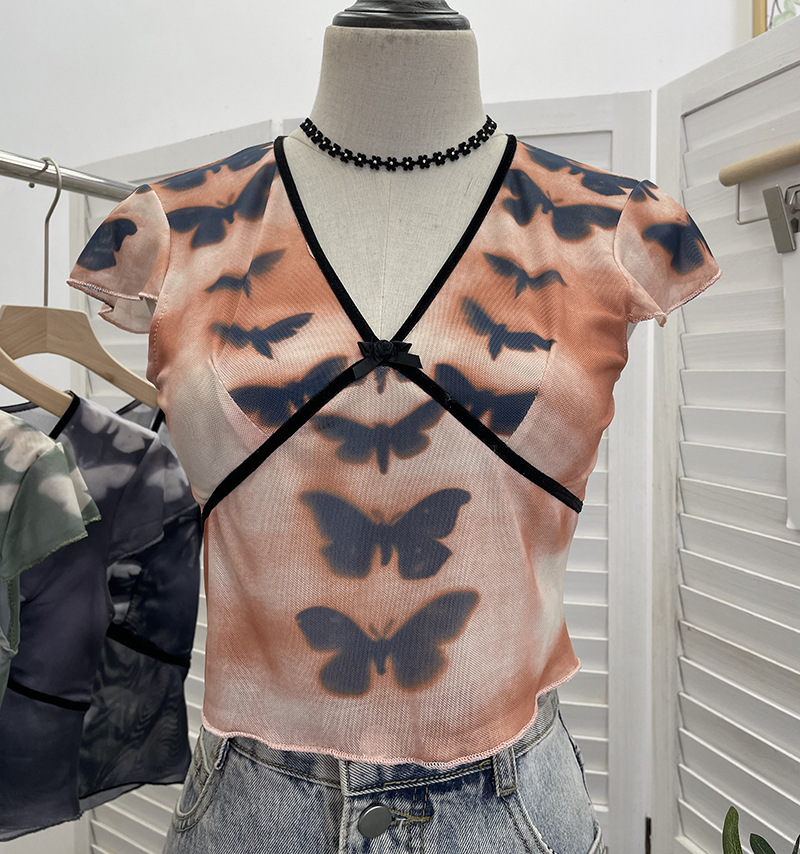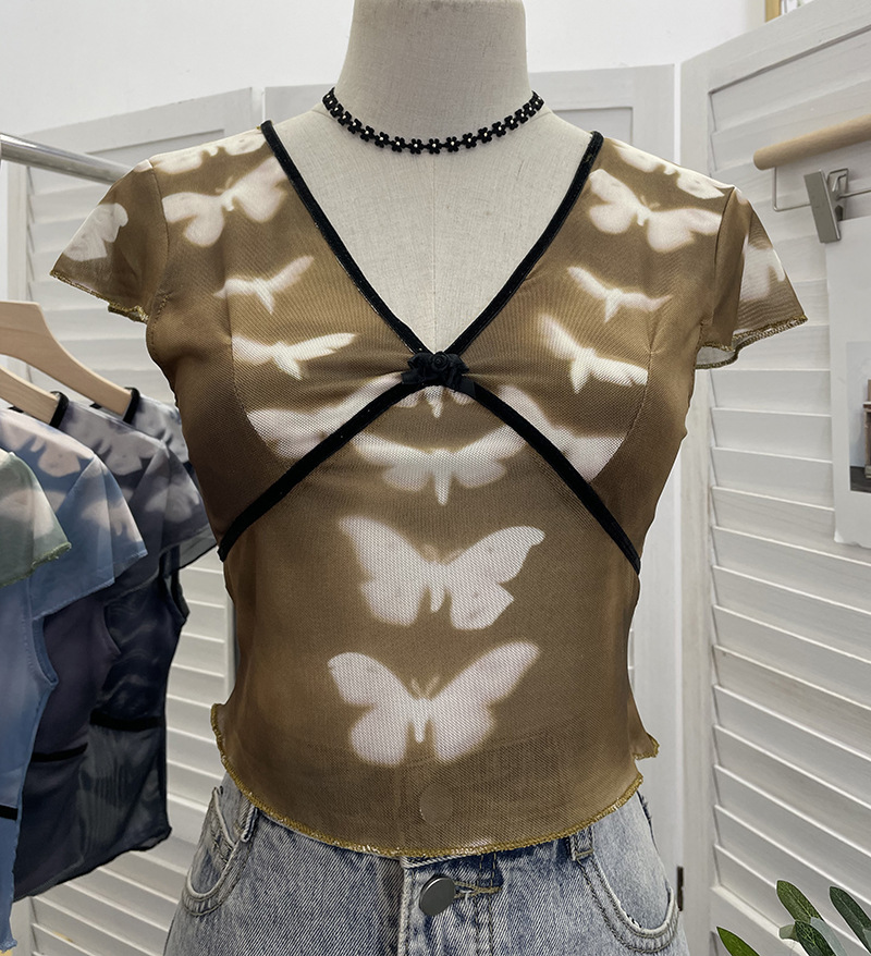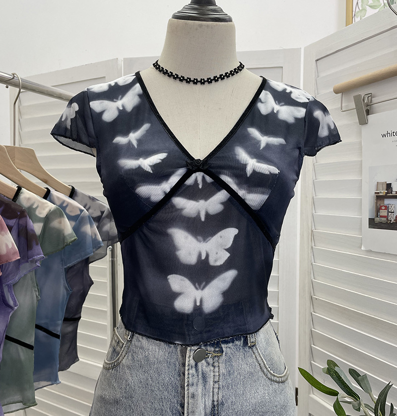 Uveng Sexy Hottie V-Neck Butterfly Print Short-Sleeved T-Shirt Slime Short-Navel Net T-Shirt Girl 9920