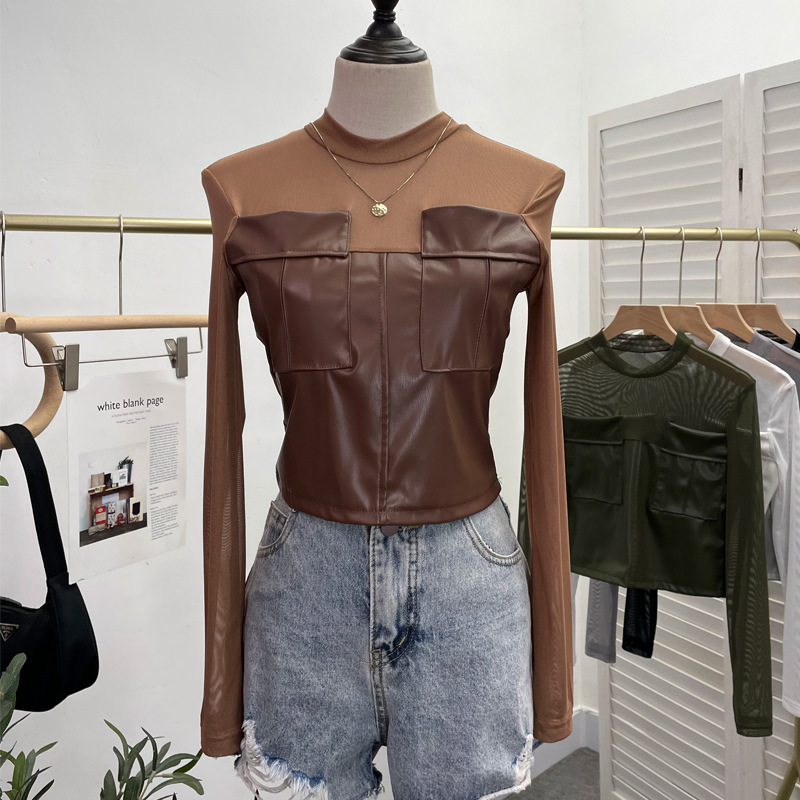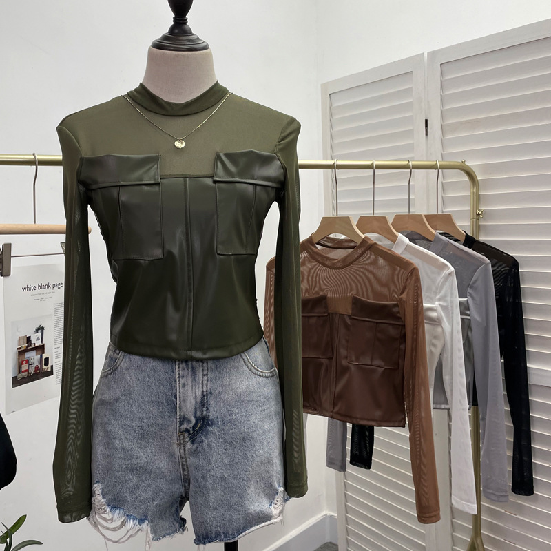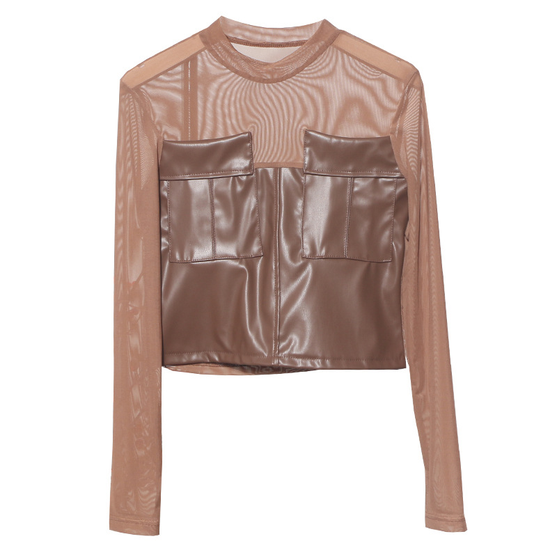 Uveng Sexy Micro-Permeable Mesh Splicing Pu Skin Bottom Shirt Women Autumn And Winter Body Repair Short Long-Sleeved T-Shirt Top 8975