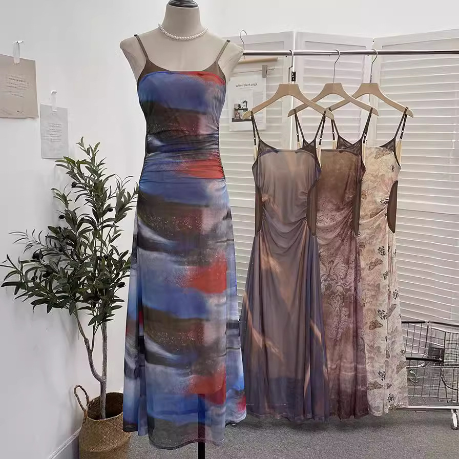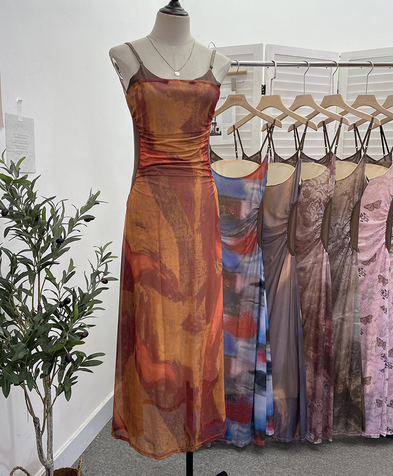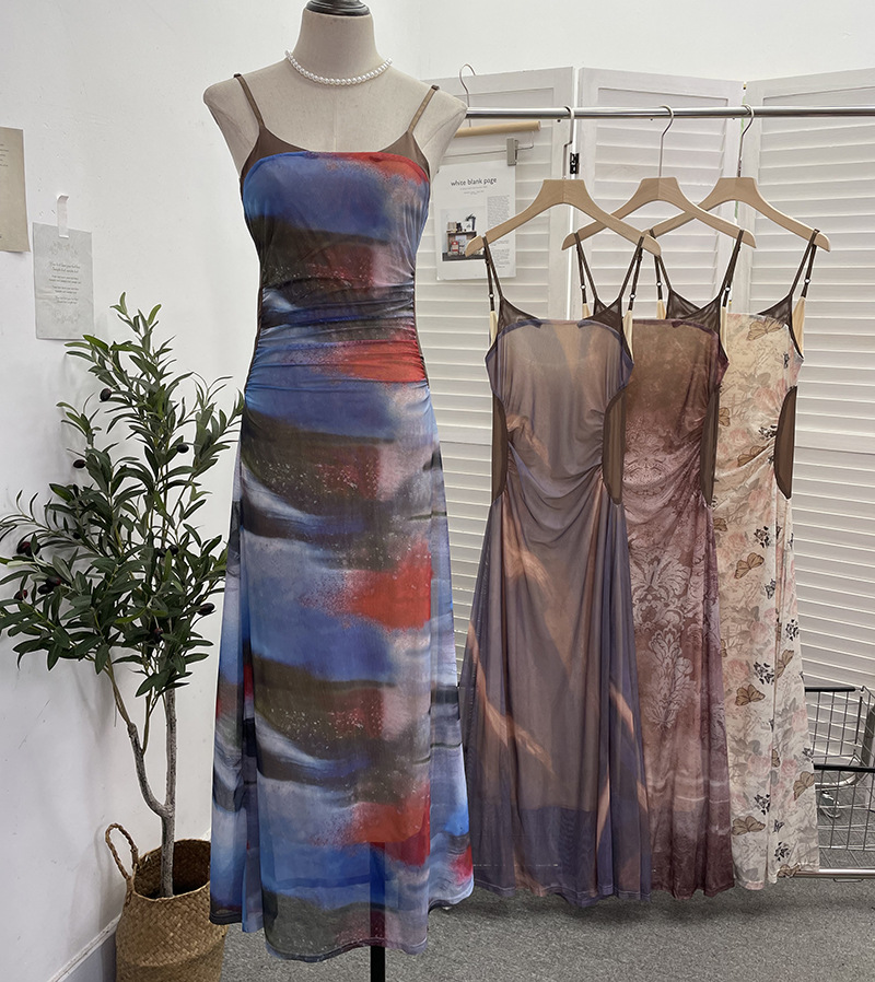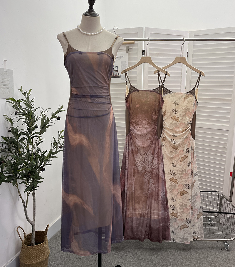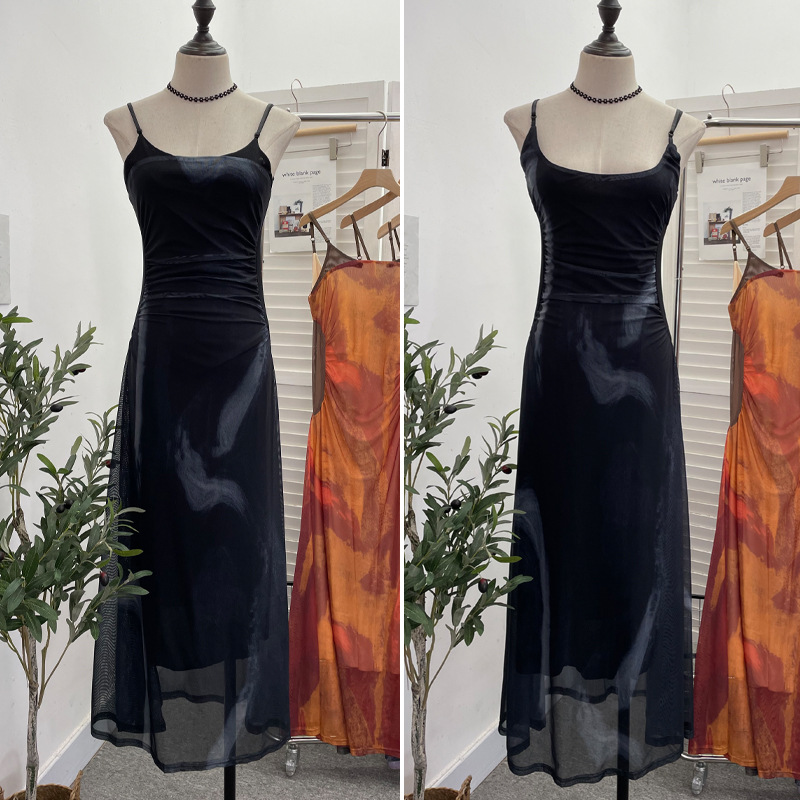 Uveng Sexy Tie-Dye Print Dress Waist Folded Folded Black Back Mesh Slings Long Skirt 888825