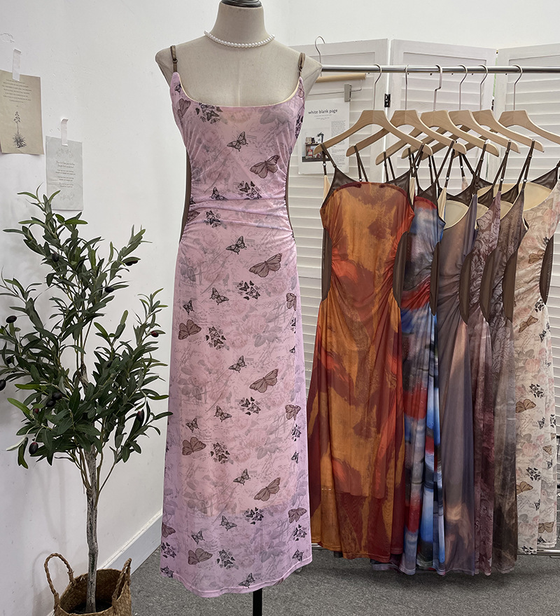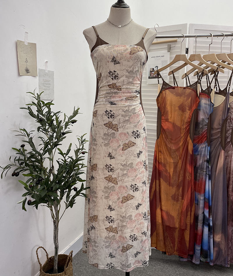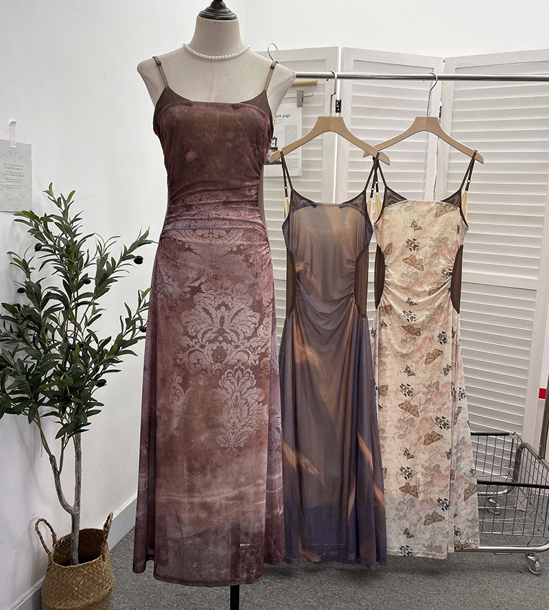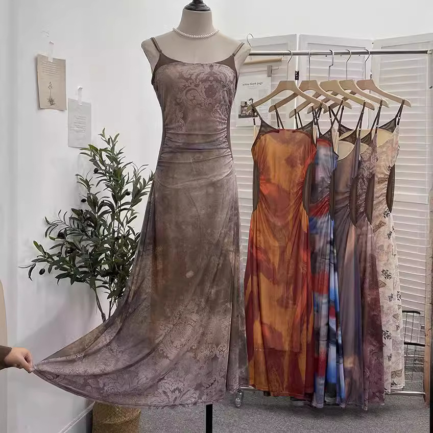 Uveng Sexy Tie-Dye Print Dress Waist Folded Folded Black Back Mesh Slings Long Skirt 888825