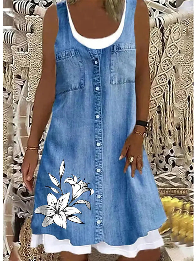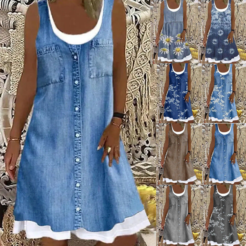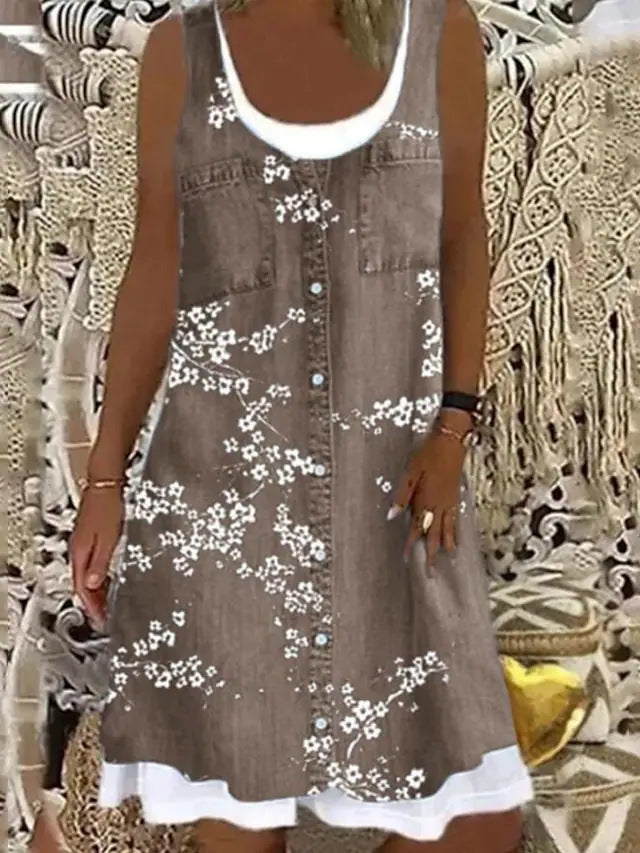 Uveng Sleeveless Stitching Printing Casual Dress Dresses