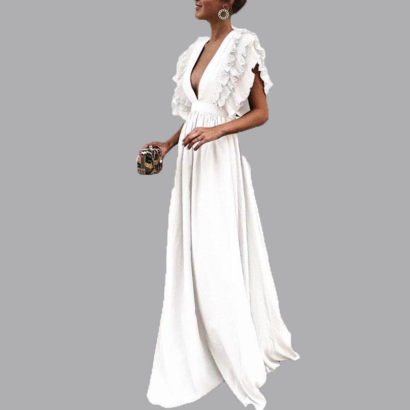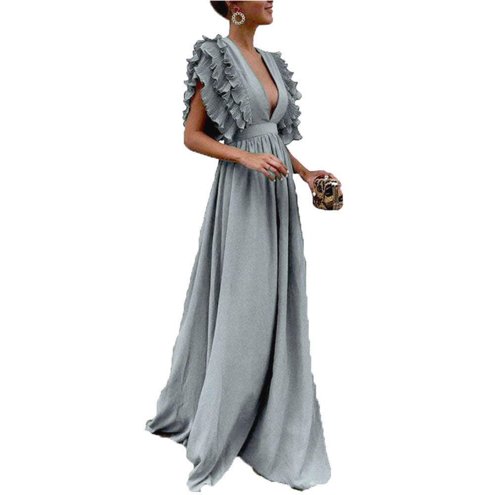 Women's Sleeves Mid Waist V-neck Backless Solid Color Long Dress