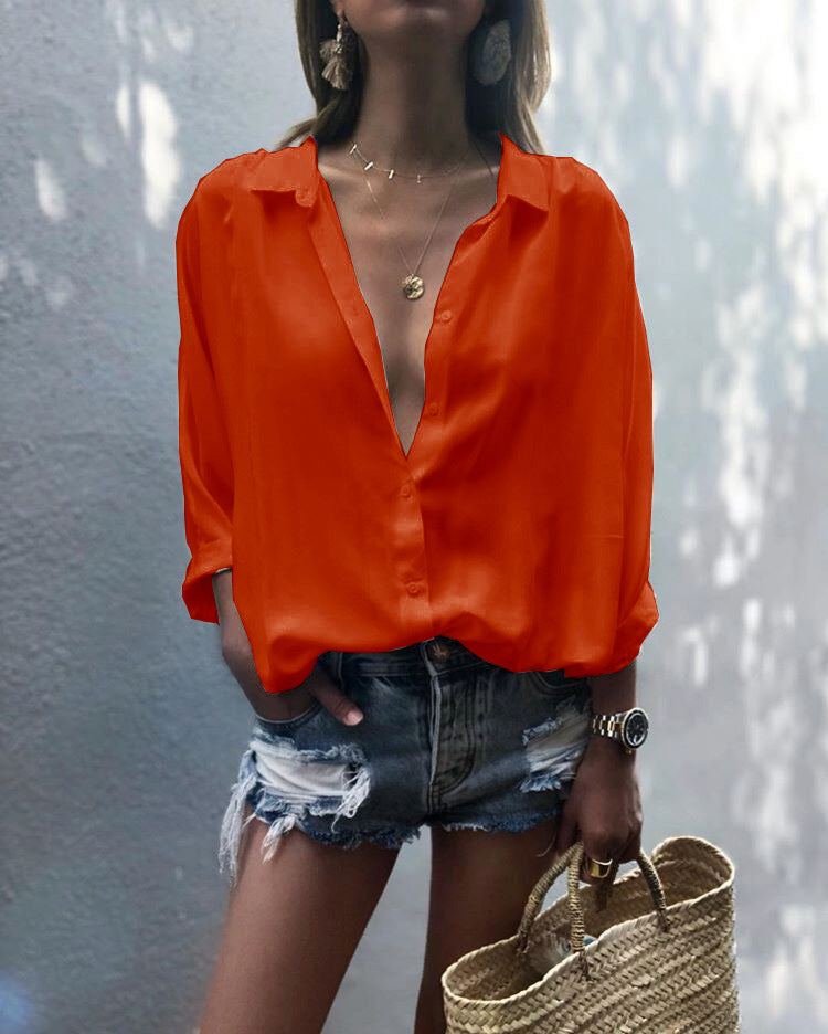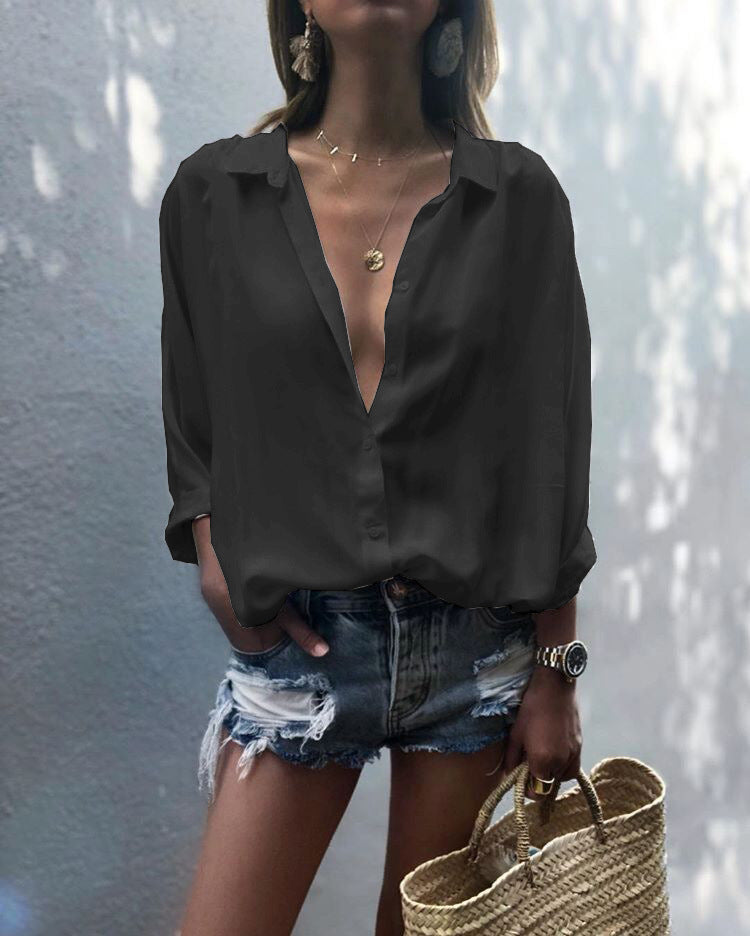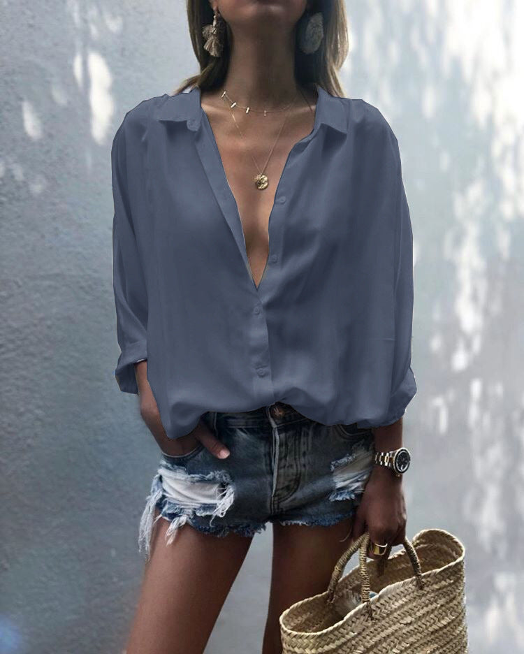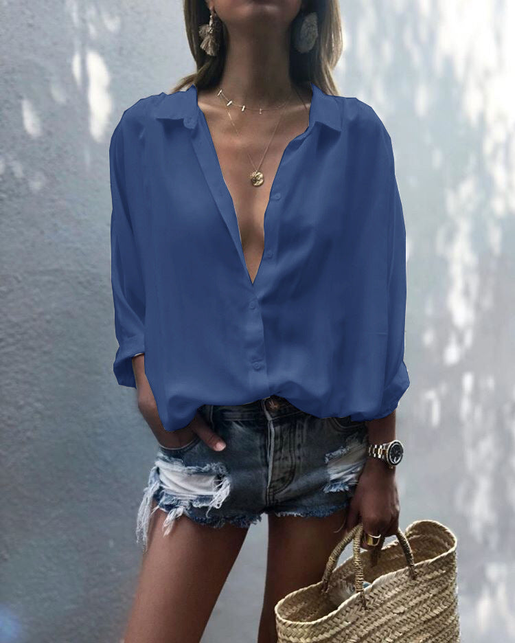 Women's Solid Color Deep V-neck Buttons Chiffon Shirt