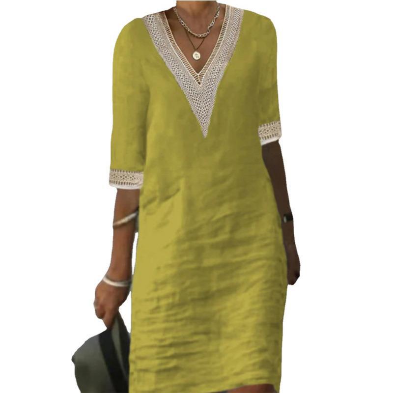 Uveng Solid Color Half Sleeve Cotton Linen Dresses
