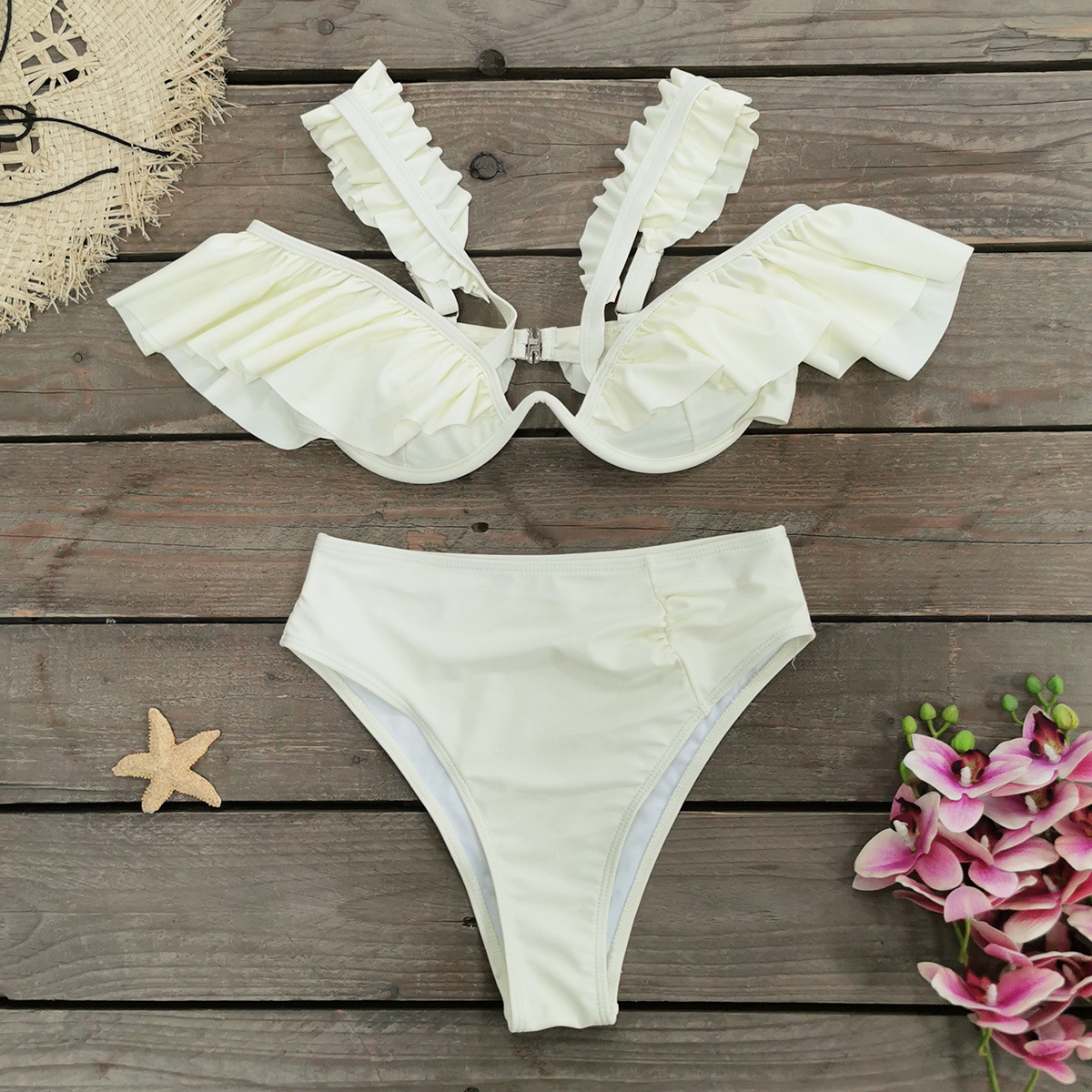 Uveng Solid-Color High-Waisted Split Swimsuit Women 2025 New Out-To-Shoulder-To-Breasted Bikini