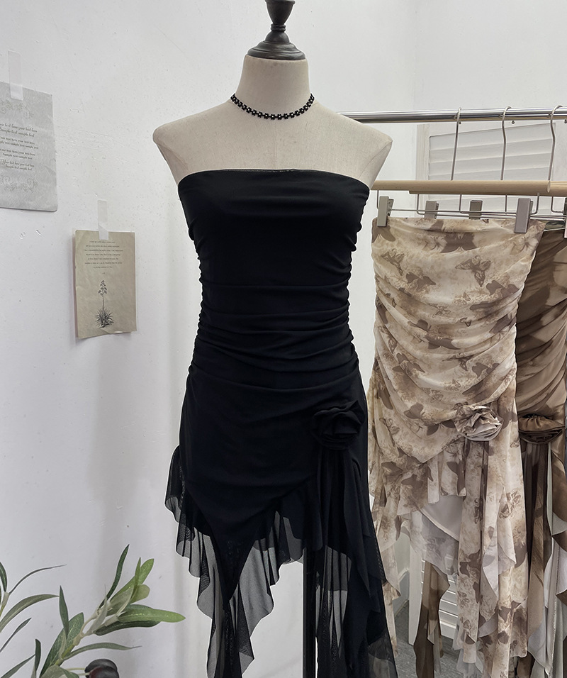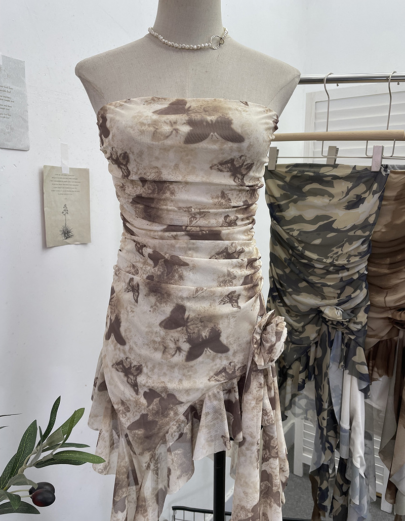Uveng Solid Shot Tie Net Yarn Printing Irregular Ribbon Three-Dimensional Flowers Small Man With Chest Short Skirt Dress Dress 6652