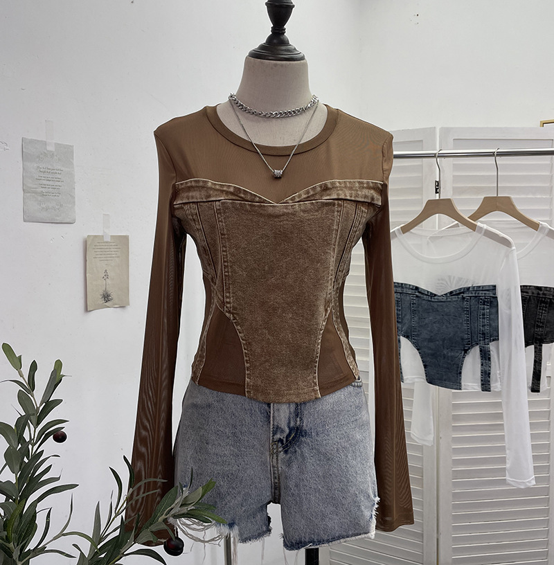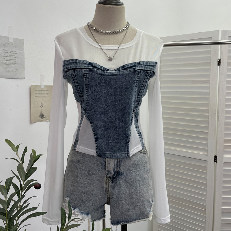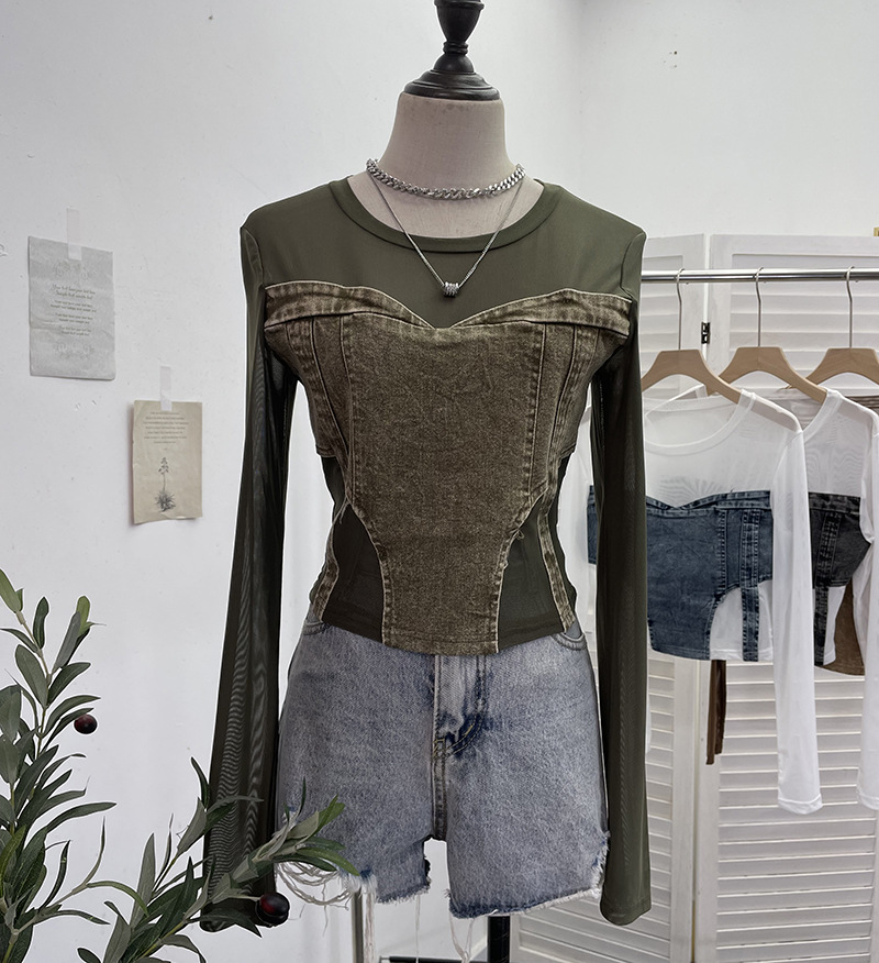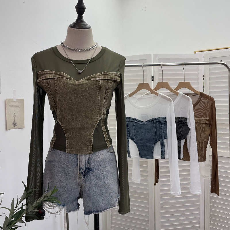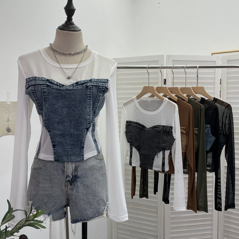 Uveng Spice Girls Design Sense Net纱 Stitched With Denim Blouse Long-Sleeved Bottom Shirts To Dress Short Niche T-Shirt 2633