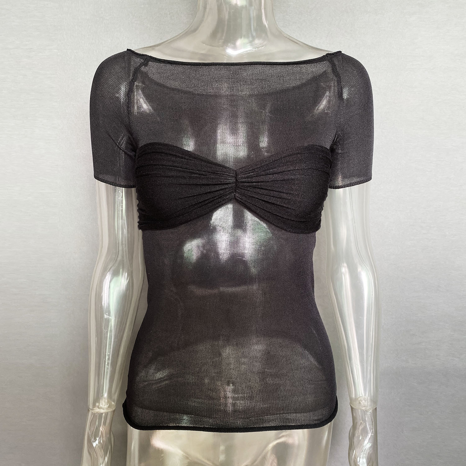 Uveng Spring And Summer Explosion Women's Dress A Word Collar Perspective Short-Sleeved T-Shirt Top