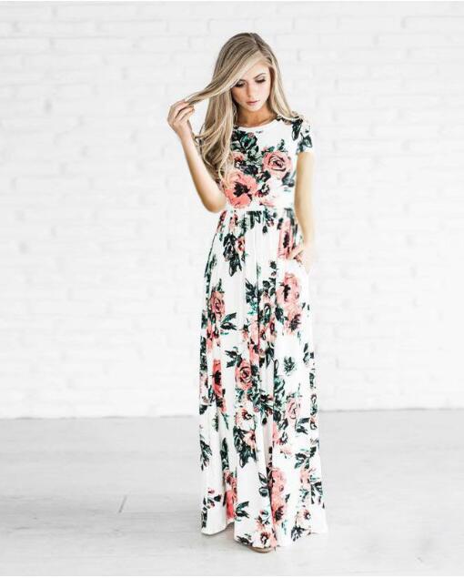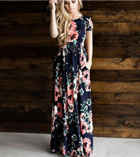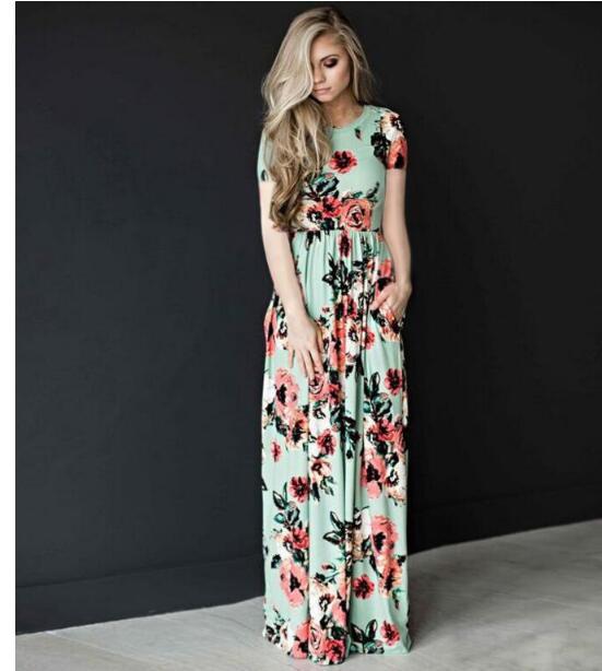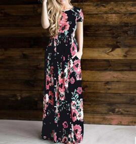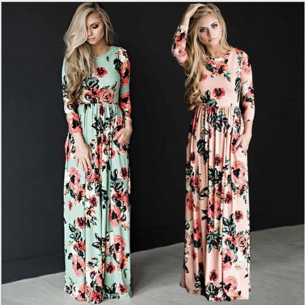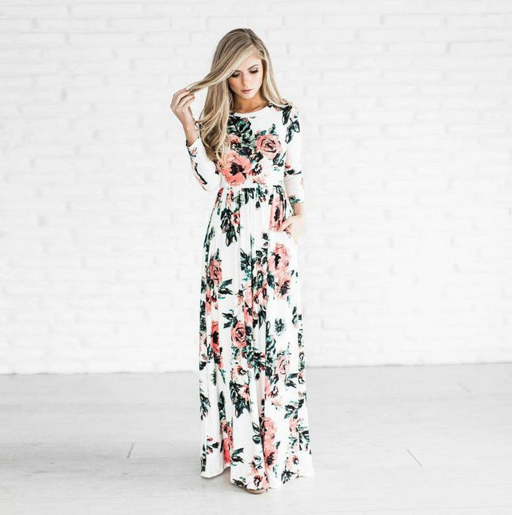 Printing Summer Round Neck Flowers Print Long Sleeve Dress