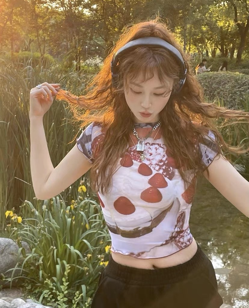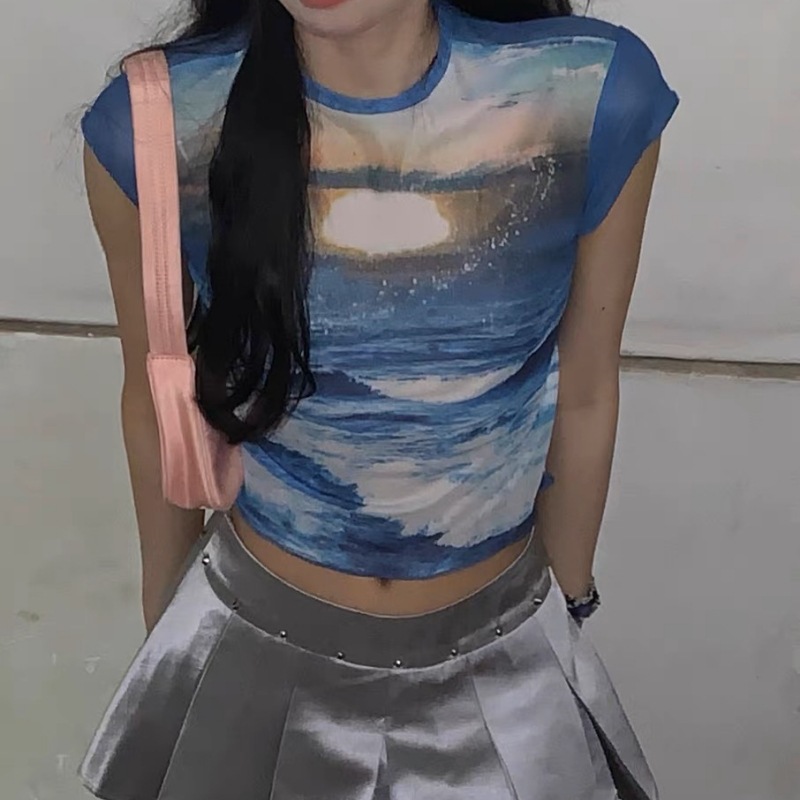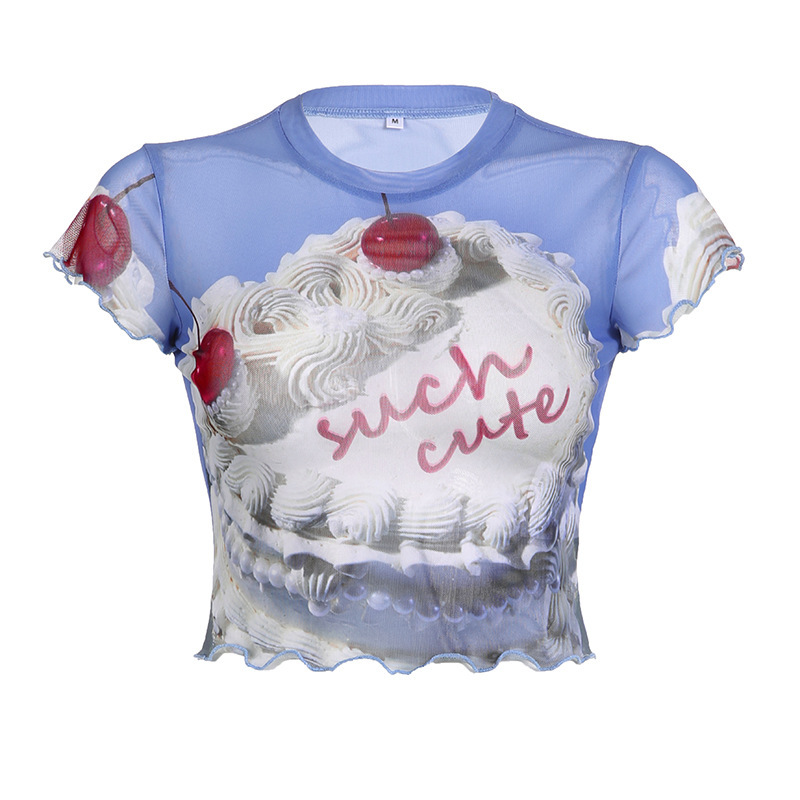 Uveng Sweet Wind Collar Bag Sleeve Cherry Cake Blue T-Shirt In Fashion Summer Wood Ear Exposed Umbilical Babes Top