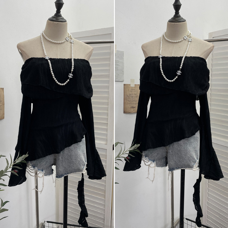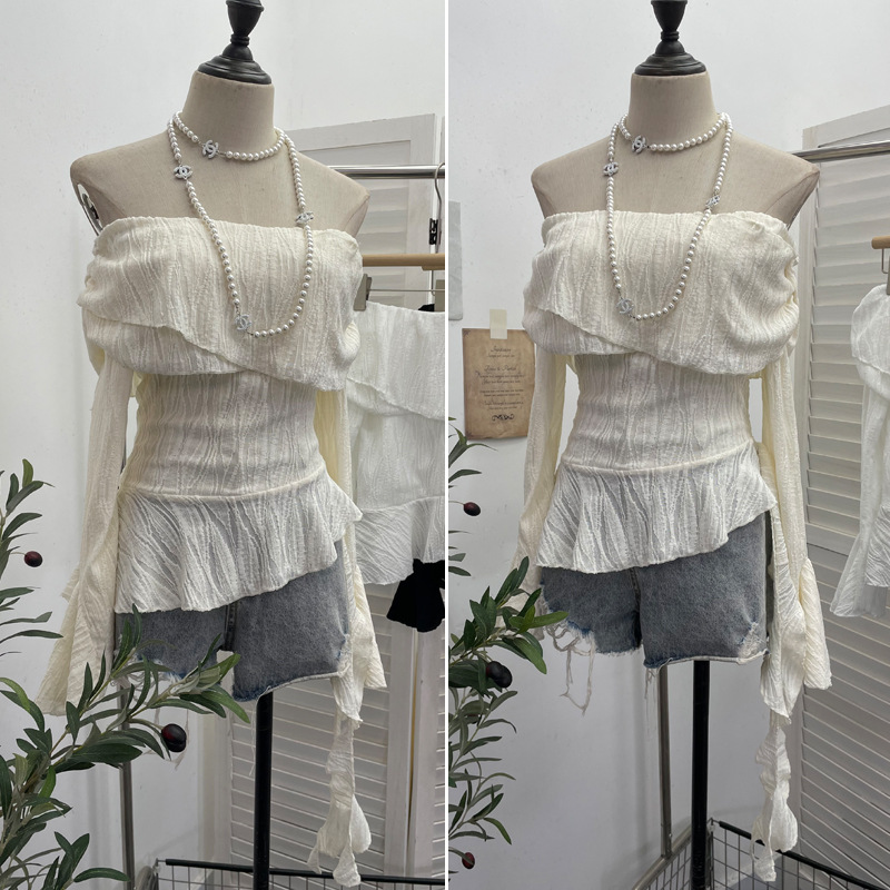 Uveng The Ballet Style Shoulder Fold Texture Texture Coat Irregularly Ribbon Horn Sleeve Short Shirt 1158