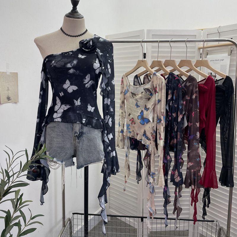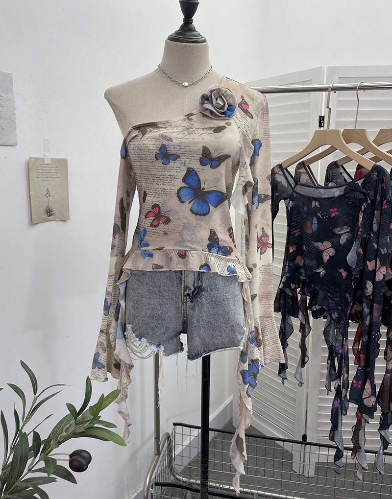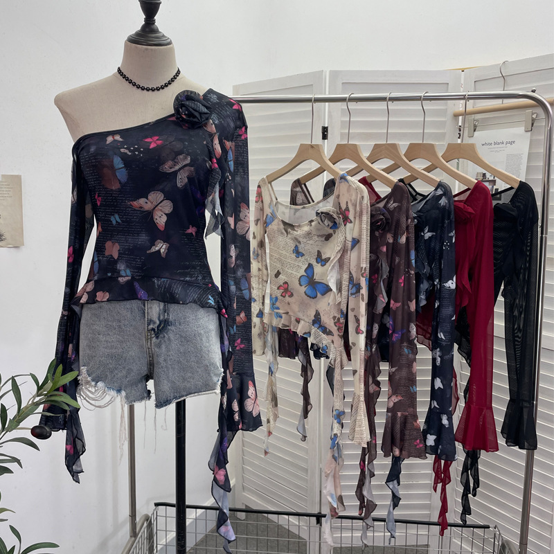 Uveng Tie Dyed Elastic Mesh Oblique Shoulder Irregular Horn Long-Sleeved T-Shirt Flower Short Floated Female 9932