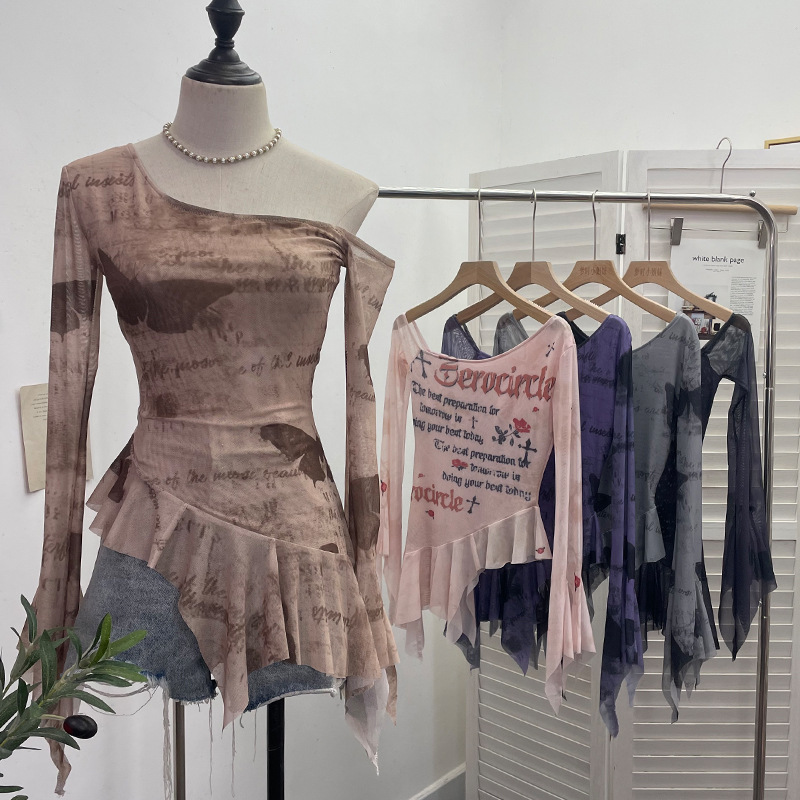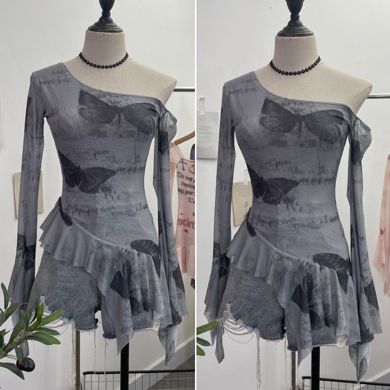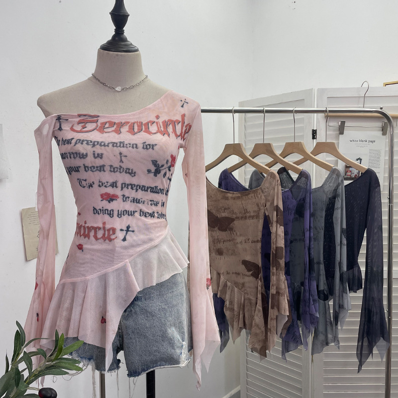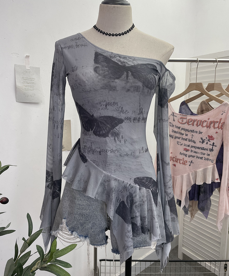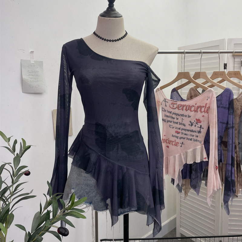 Uveng Tie Tie Net Yarn Oblique Shoulder Babes Sexy Body-On-Sleeve Horn Irregular Top 9955