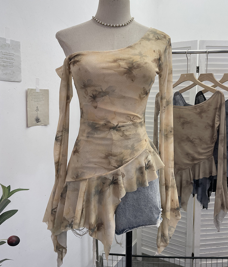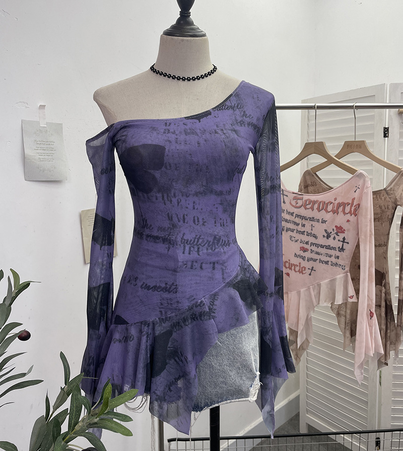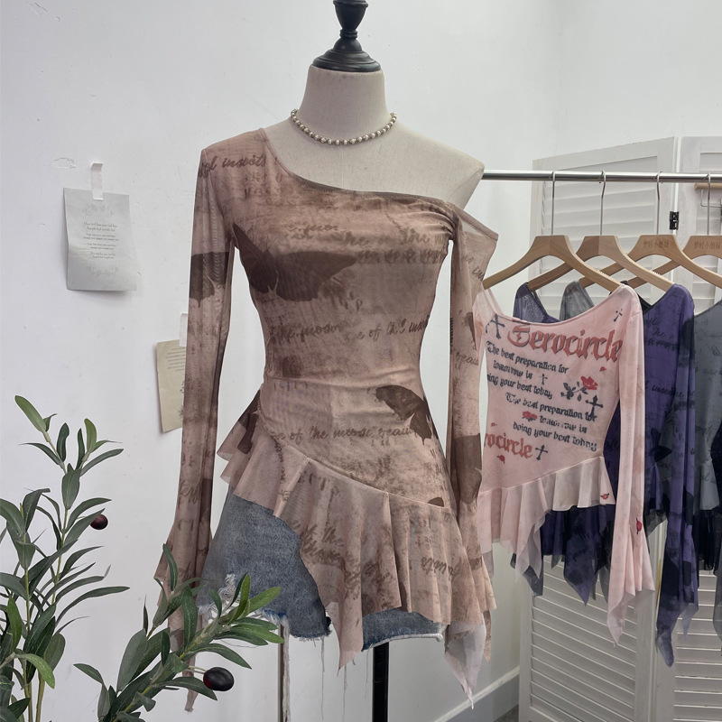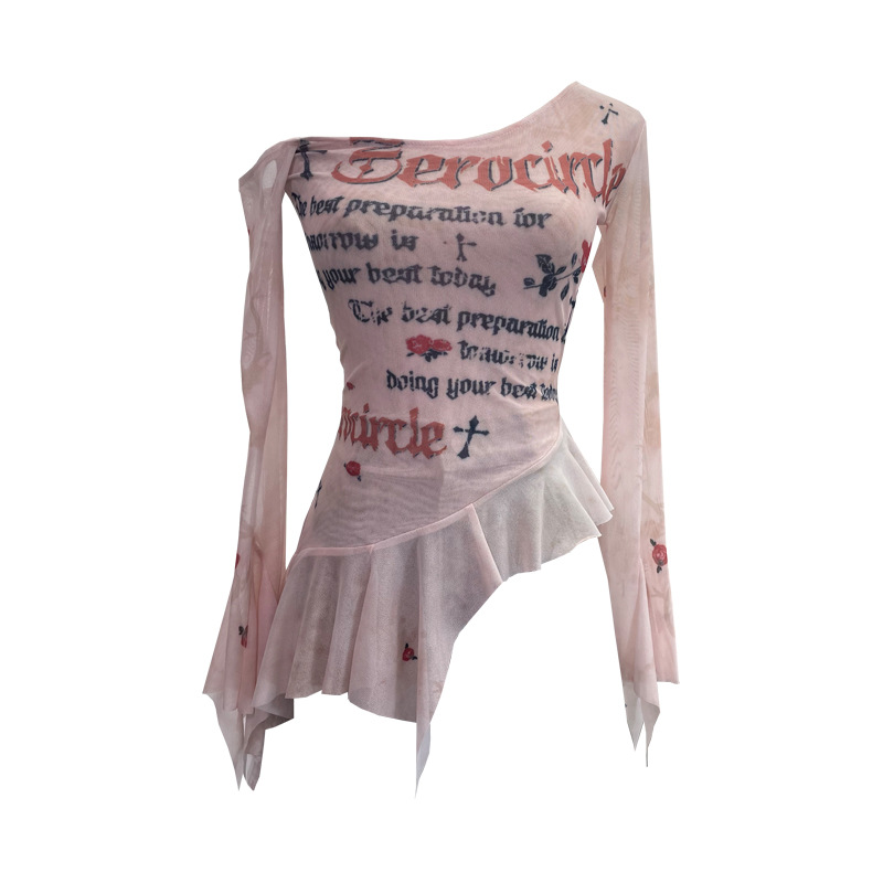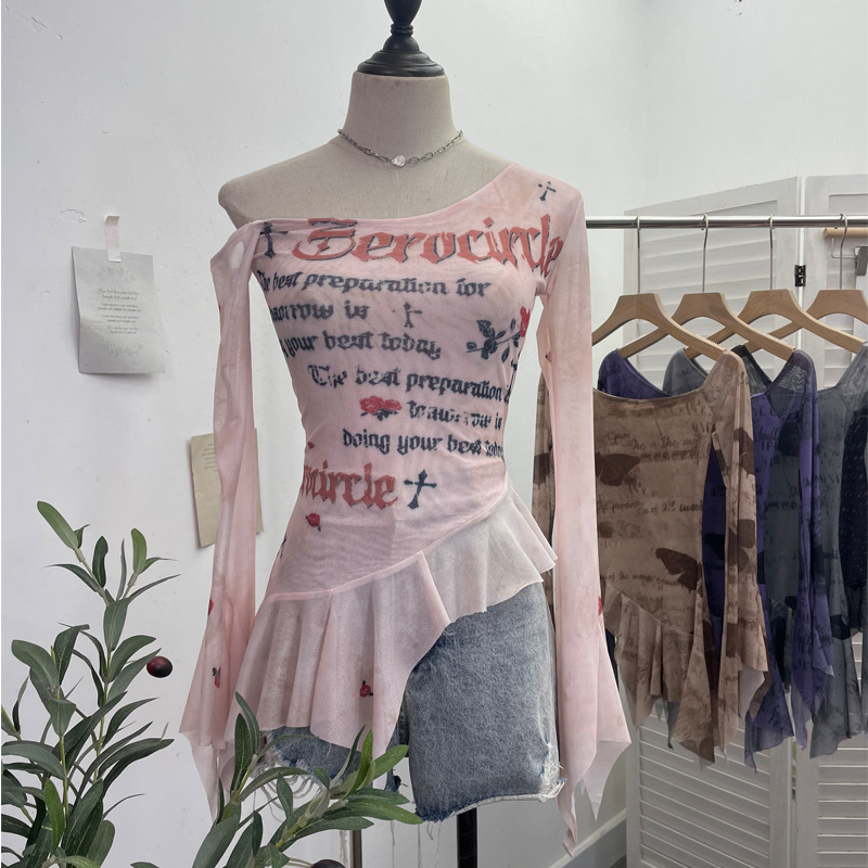 Uveng Tie Tie Net Yarn Oblique Shoulder Babes Sexy Body-On-Sleeve Horn Irregular Top 9955