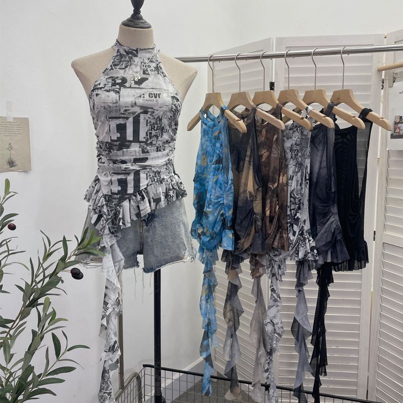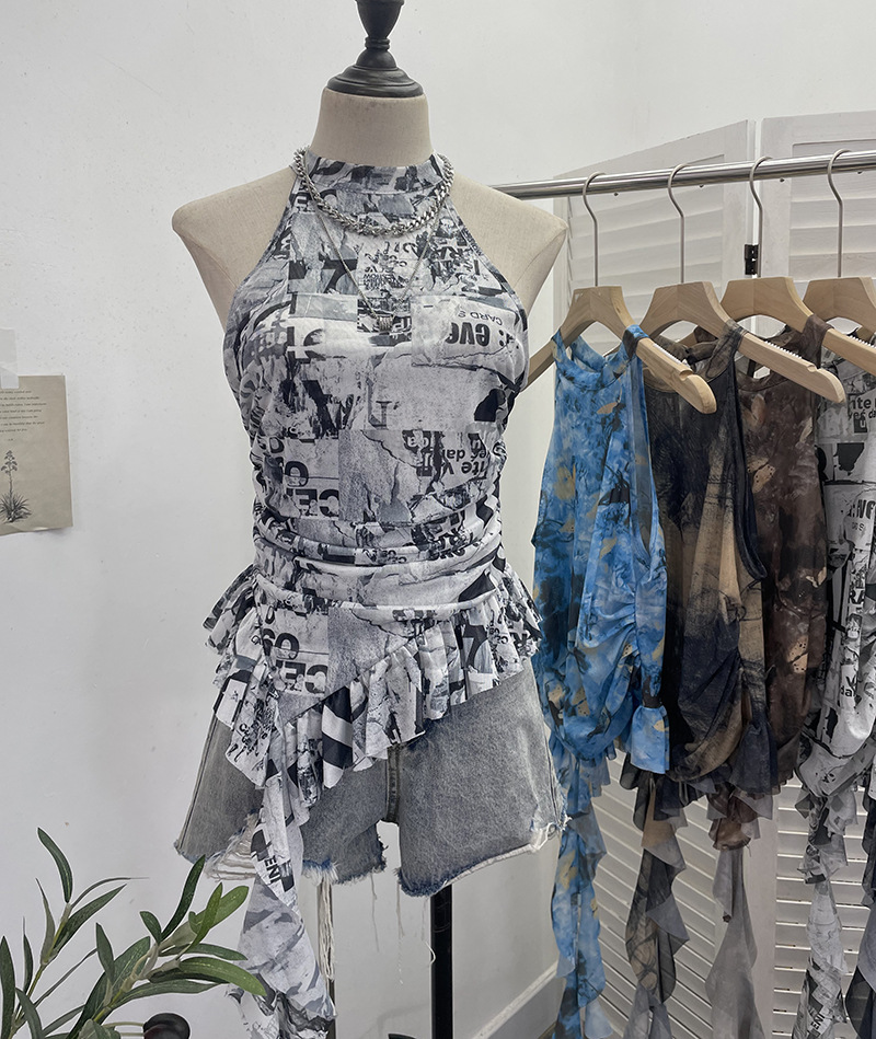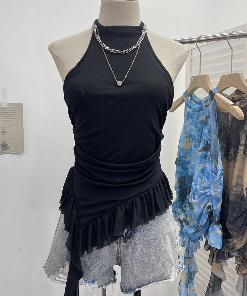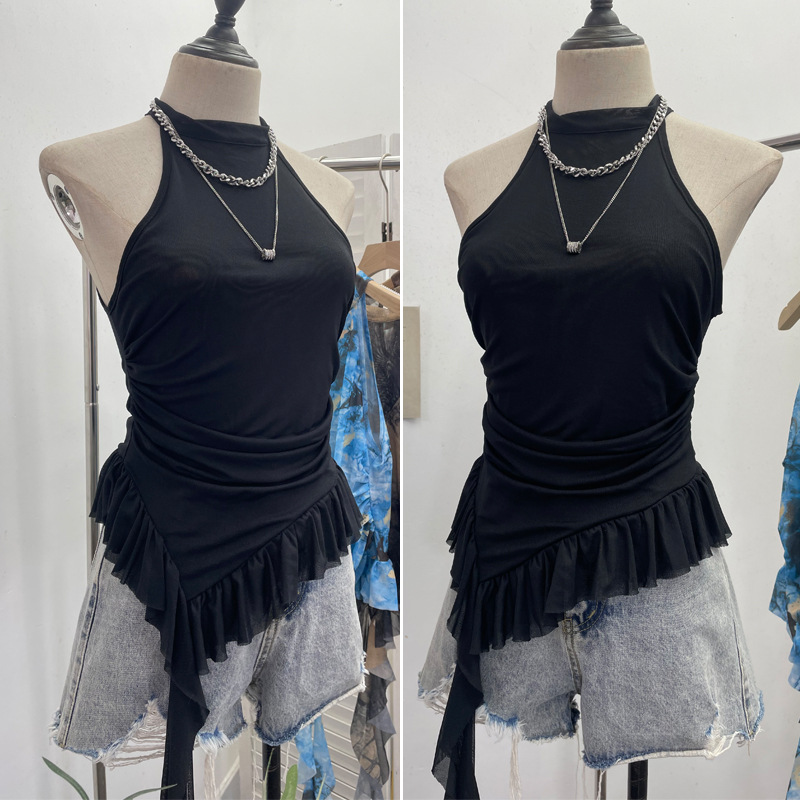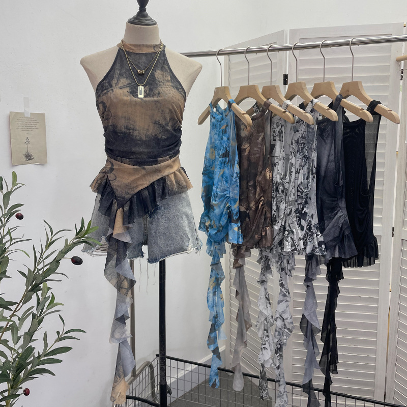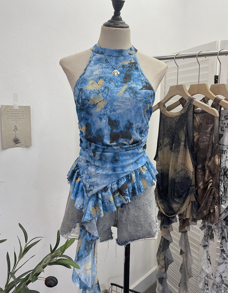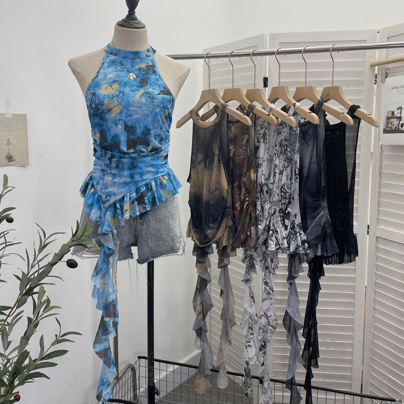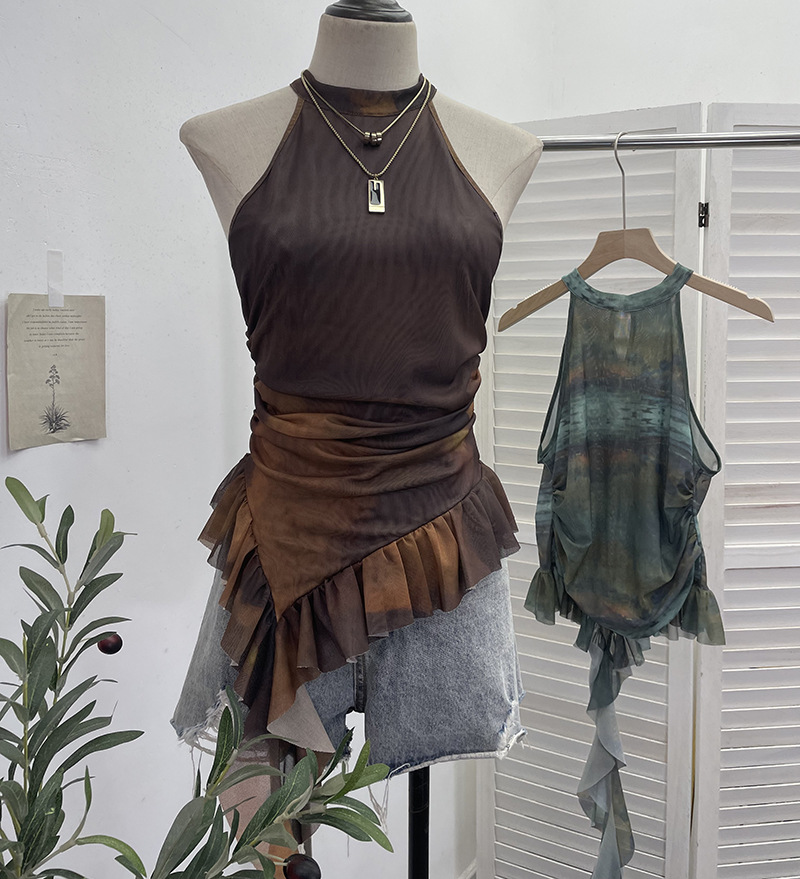 Uveng Trend Irregular Hanging Neck Dyeing Net Yarn Vest Lotus Side Ribbon Short Sleeveless Top 9969