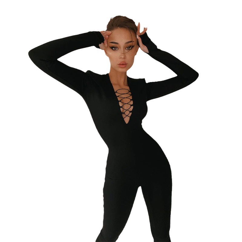 Uveng Uveng 2023 New Hollow Cross Strap Design Small Long Sleeve Bottom Solid Color Jumpsuit