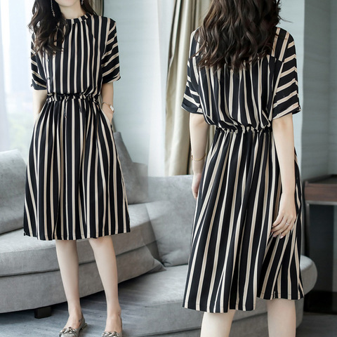 Uveng Uveng 2023 New Korean Version Of The Waist Temperament Fashion Casual Loose In The Long Striped Dress Women's Clothing