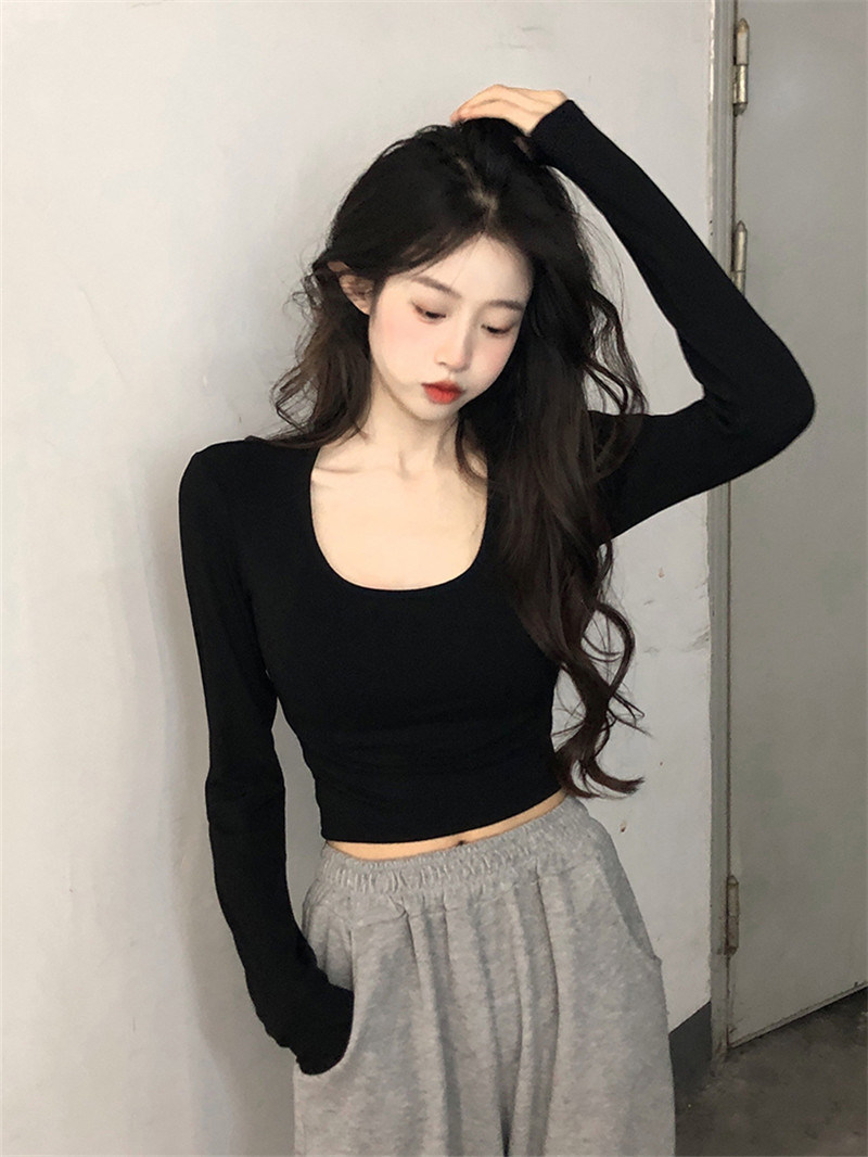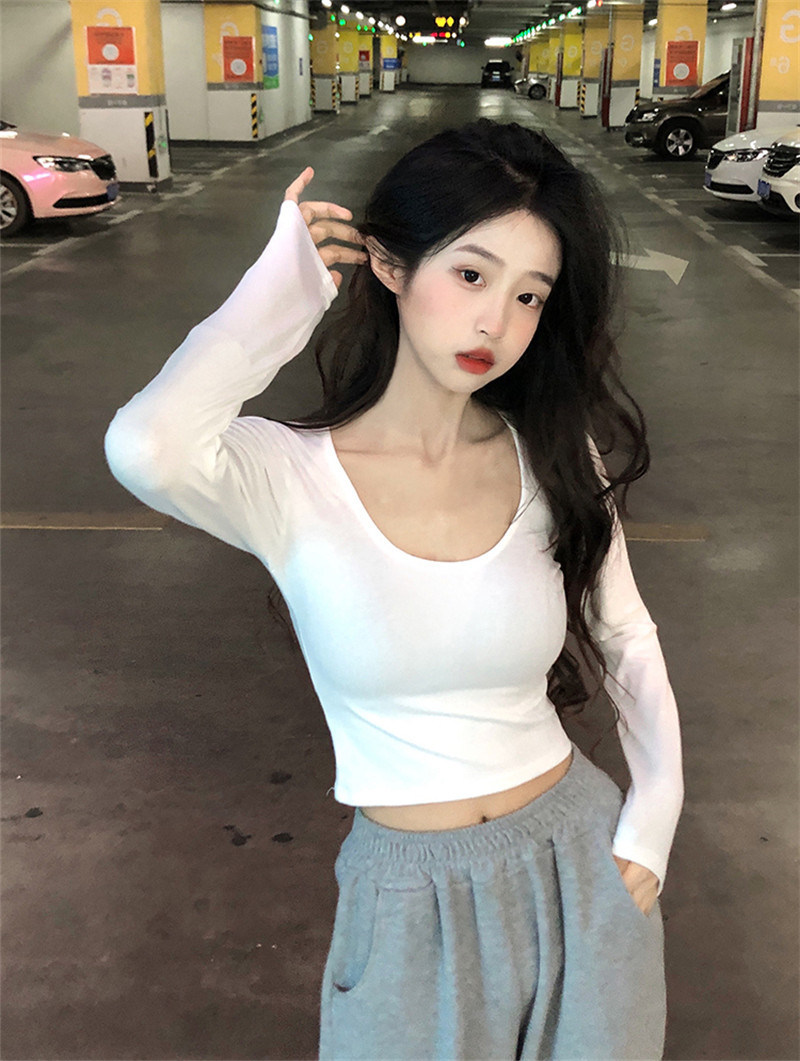 Uveng Uveng 2023 New Pure Desire Wind Hot Girl Big U Collar Show Slim Short White Long Sleeve T Shirt Jacket Women's Fashion
