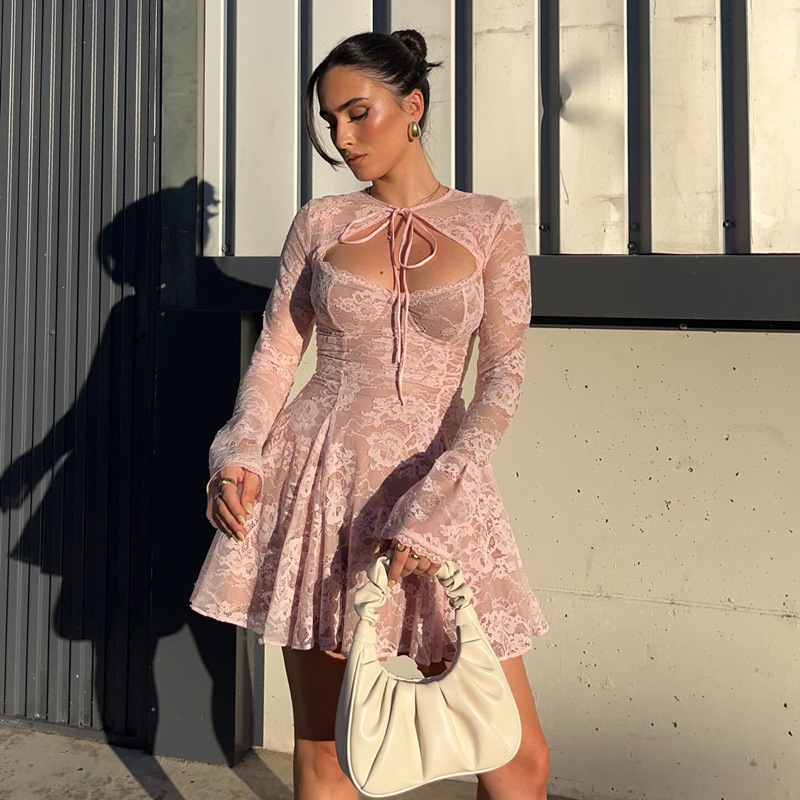 Uveng Uveng 2024 New Fashion Sexy Lace Pink Vest Horn Sleeve Halter Skirt Suit Girl