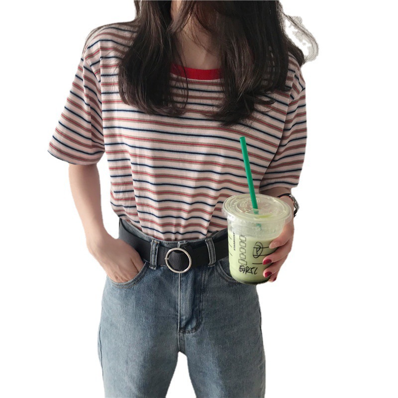 Uveng Uveng 2024 New Striped Short-Sleeved T-Shirt Korean Version Bottom Shirt Women's Student Top Women's Clothing
