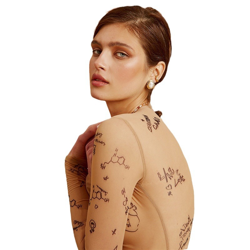 Uveng Uveng 2024 Summer New Women's Round Collar Long Sleeve Fashion Mesh Perspective Sexy Slim Onesie Women