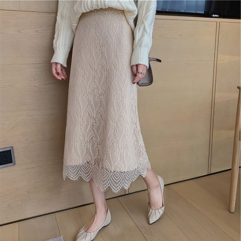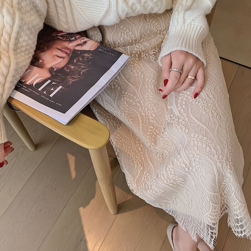 Uveng Uveng Autumn And Winter Lace Knitted Skirt Women With Sweater High-Waisted A Word Two Sides Wear Medium Long Wool Skirt Thick