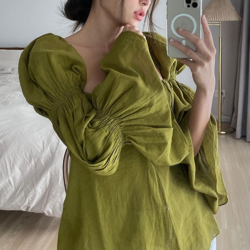 Uveng Uveng Autumn New Sweet French Square Collar Pleated Horn Sleeve Design Sense Top Women's Wear
