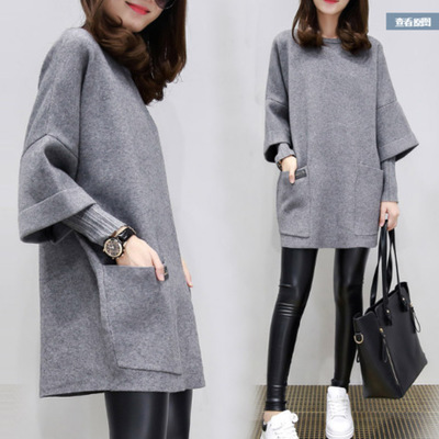 Uveng Uveng Autumn / Winter New Plus Size Women's Fat MM Loose Splicing Long Sleeve Coat Long Solid Color Top Round Collar Hoodie
