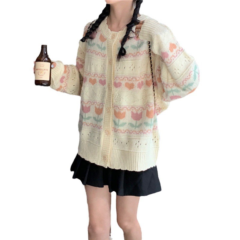 Uveng Uveng Autumn's New Retro Love-Loving Wreavage Hollow Spliced Antique Feel Loose Knitted Cardigan Women's Sweater Jacket