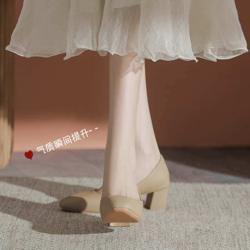 Uveng Uveng Bare-Colored High-Heeled Women's French Temperament Spring Small Square Head Coarse Working Shoes With Skirt Soft Leather Single Shoes