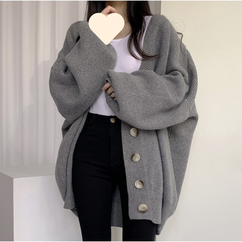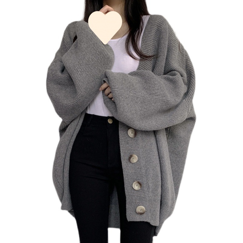 Uveng Uveng Chic Autumn And Winter Leisure Lazy Wind V-Neck Single Buckle Loose Lantern Sleeve Knitted Sweater Coat Woman
