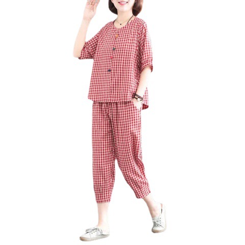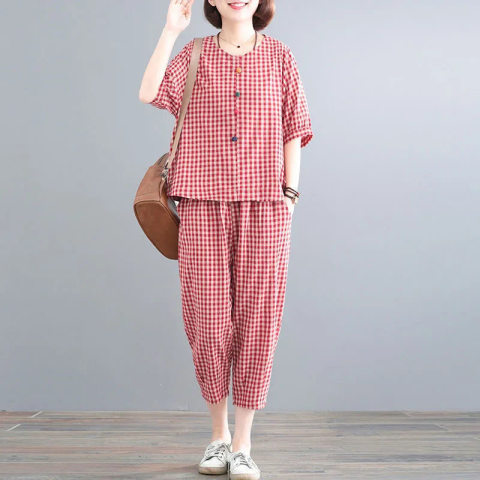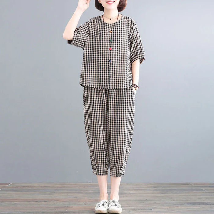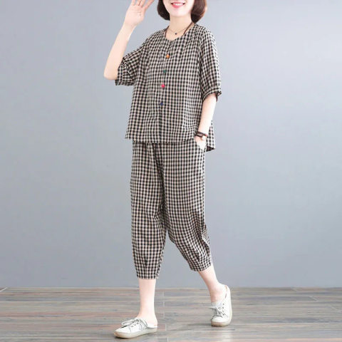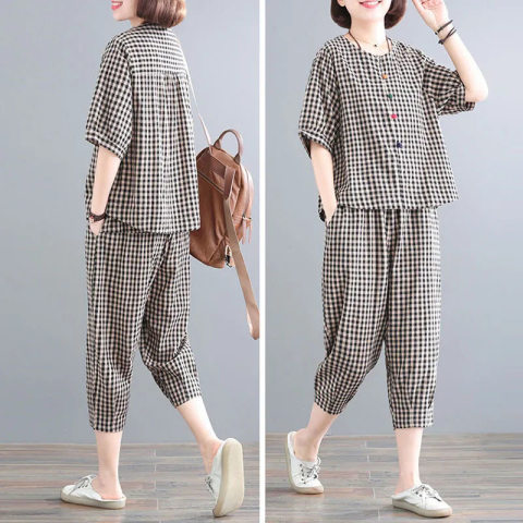 Uveng Uveng Cotton Loose Large Size Women's Foreign Style Retro Two Sets Of Temperament Female Casual Grid Suit Female 2023 Summer Tide