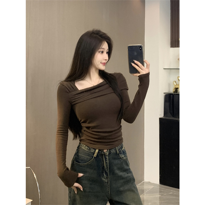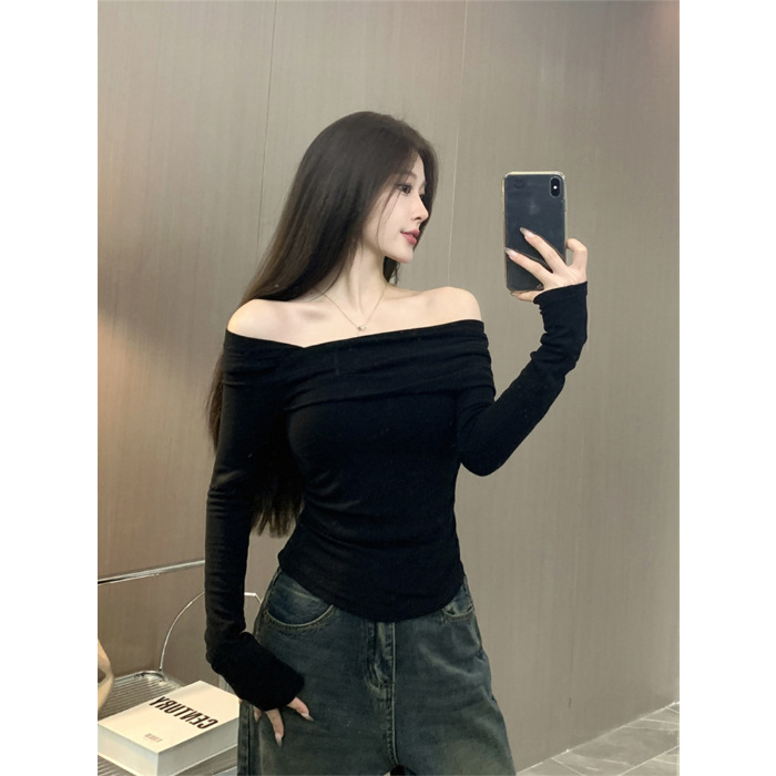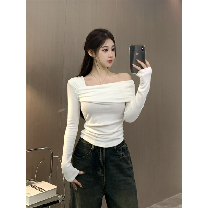Uveng Uveng Desire Sexy Hot Girl De Long Sleeve Bottom Shirt Jacket Female 2024 Slim Velvet Inclined Collar A Word Shoulder T-Shirt Tide