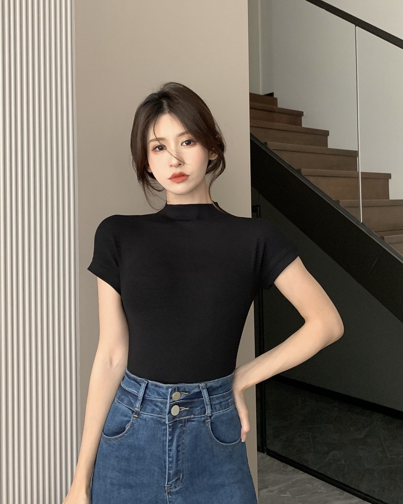 Uveng Uveng Desire Wind Half High Turtleneck Short-Sleeved T-Shirt Female 2024 Summer Slim Show Thin Bottom Shirt With Student Jacket Ins Tide