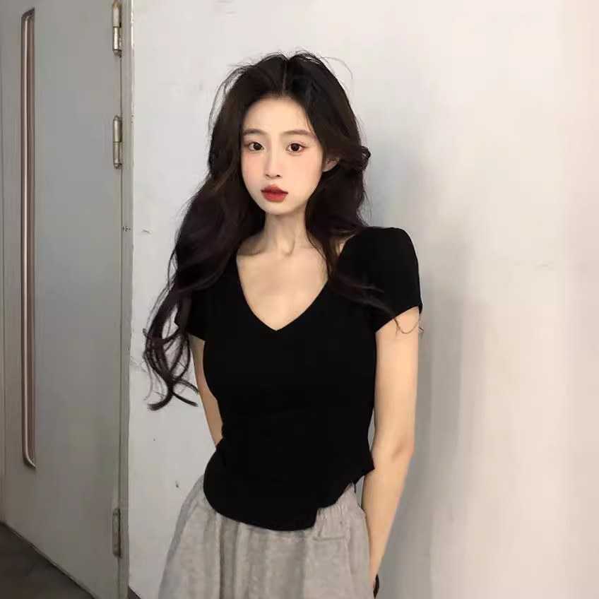 Uveng Uveng Desire Wind V Collar Short Sleeved T Shirt Female Summer 2024 New Slim Show Thin Hot Girl Short Irregular Bottom Top
