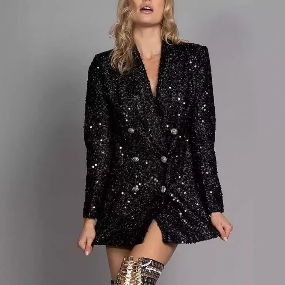 Uveng Uveng Fashion V-Neck Temperament Blazer Double-D Row Black Brighten Long Top