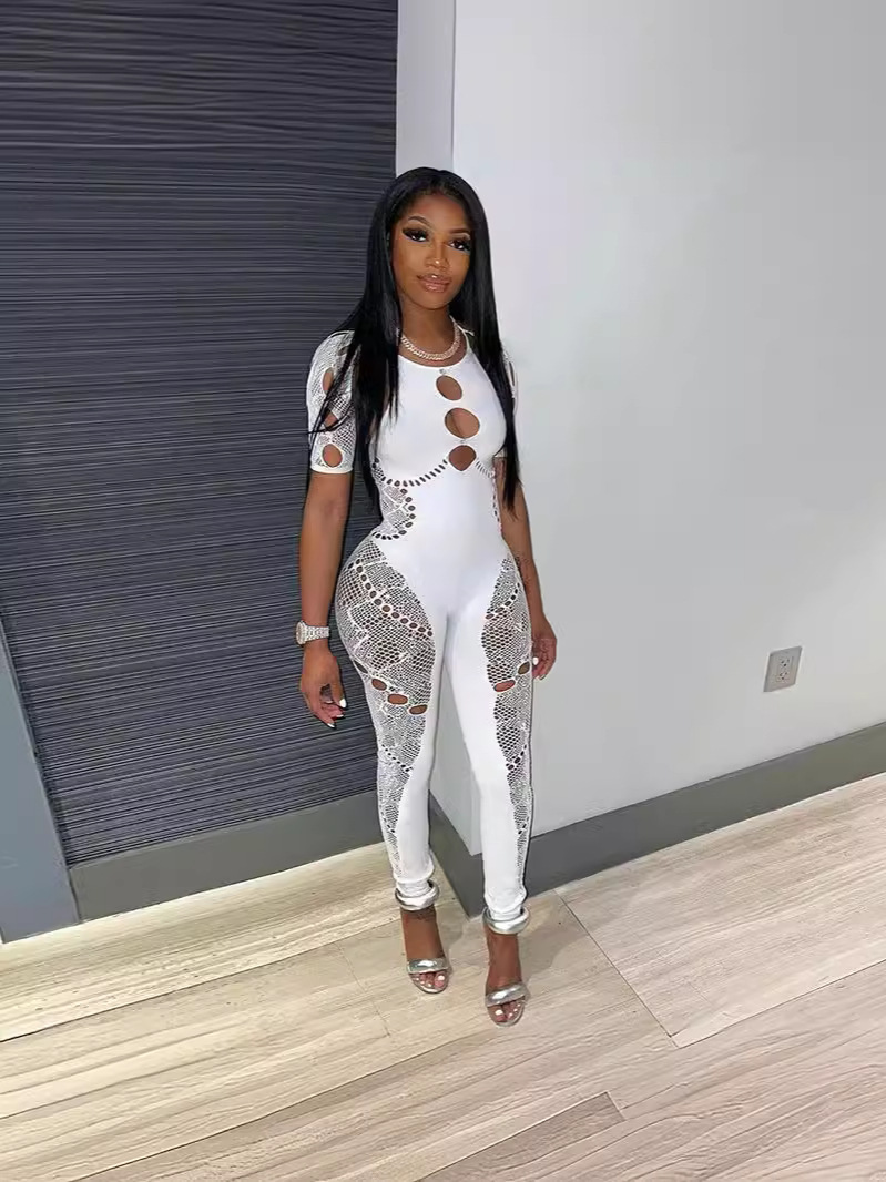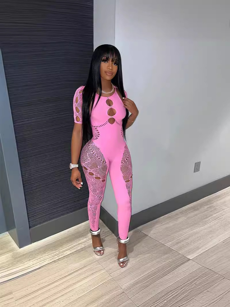 Uveng Uveng Female Solid Color Round Collar Hollow Short Sleeve Lace Sexy Body Knit Short Sleeve Jumpsuit