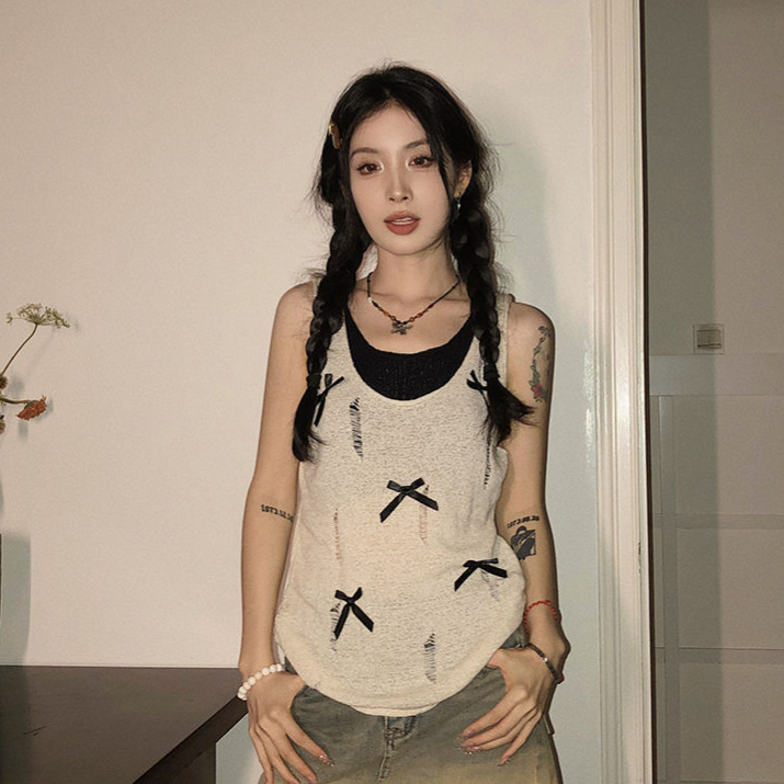 Uveng Uveng Girl Bows With Two Slings Vest Summer Dress Design Hole-Dcupy Knitting Top