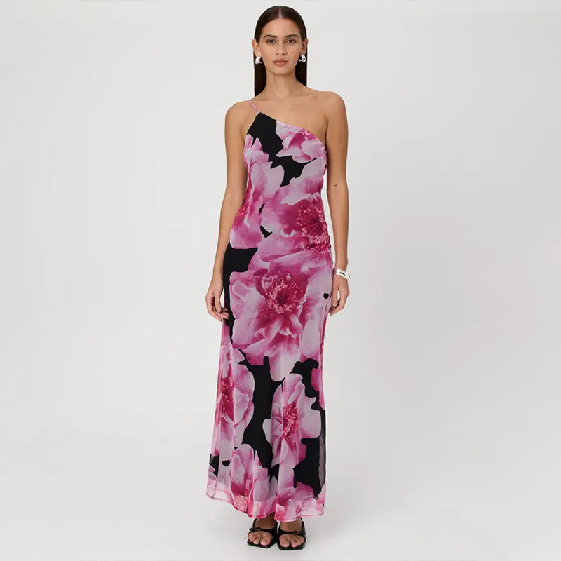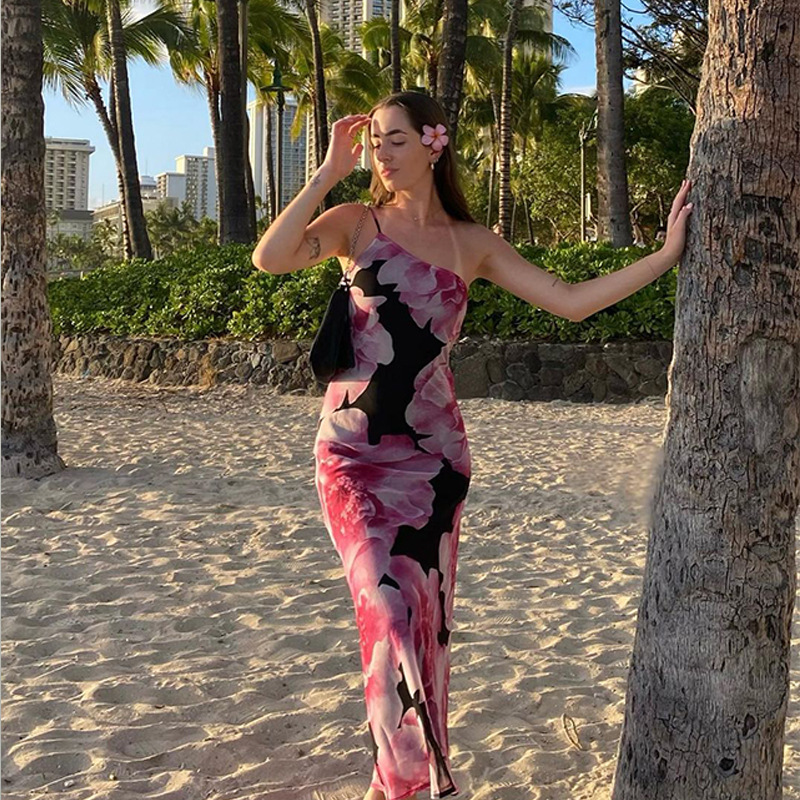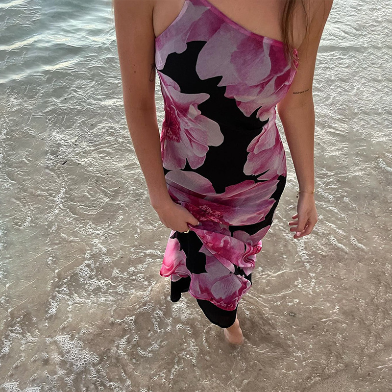 Uveng Uveng Girls 2024 Summer New Fashion Vintage Print Sexy Holiday Style Slim One-Shoulder Halter Dress