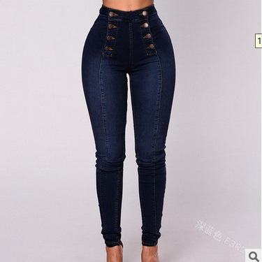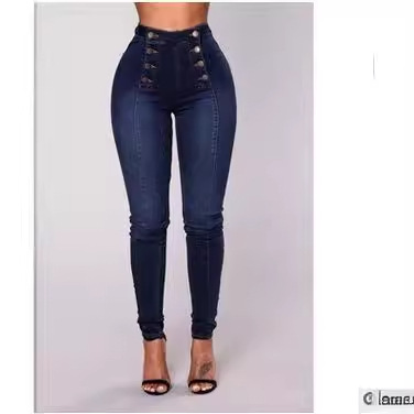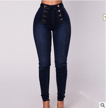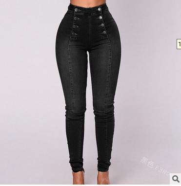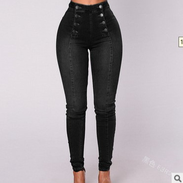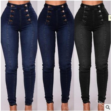 Uveng Uveng High-Waisted Casual Jeans Trousers Double Row Multi-Button Repair Elastic Small Foot Women's Pants Tide
