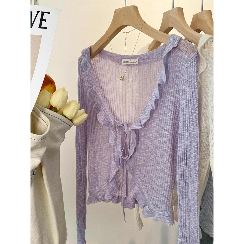 Uveng Uveng Ice Silk Knitted Cardigan Long Sleeve 2024 Summer Black Outer Short Air Conditioning Shirt Sunscreen Shawl Woman