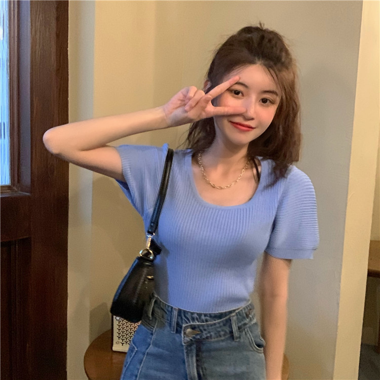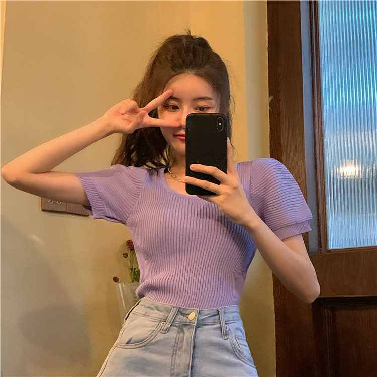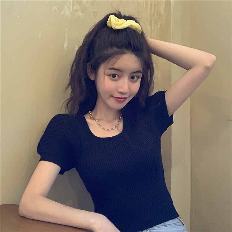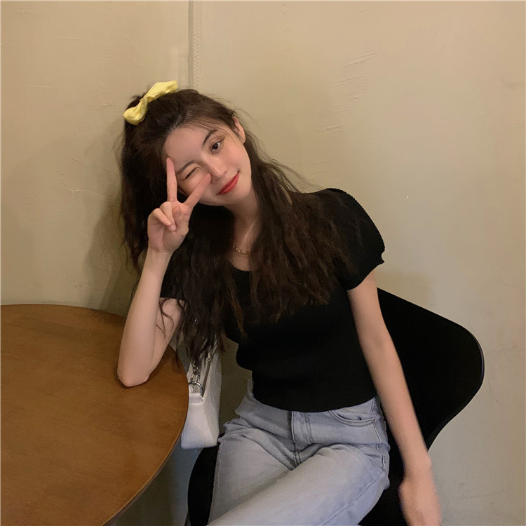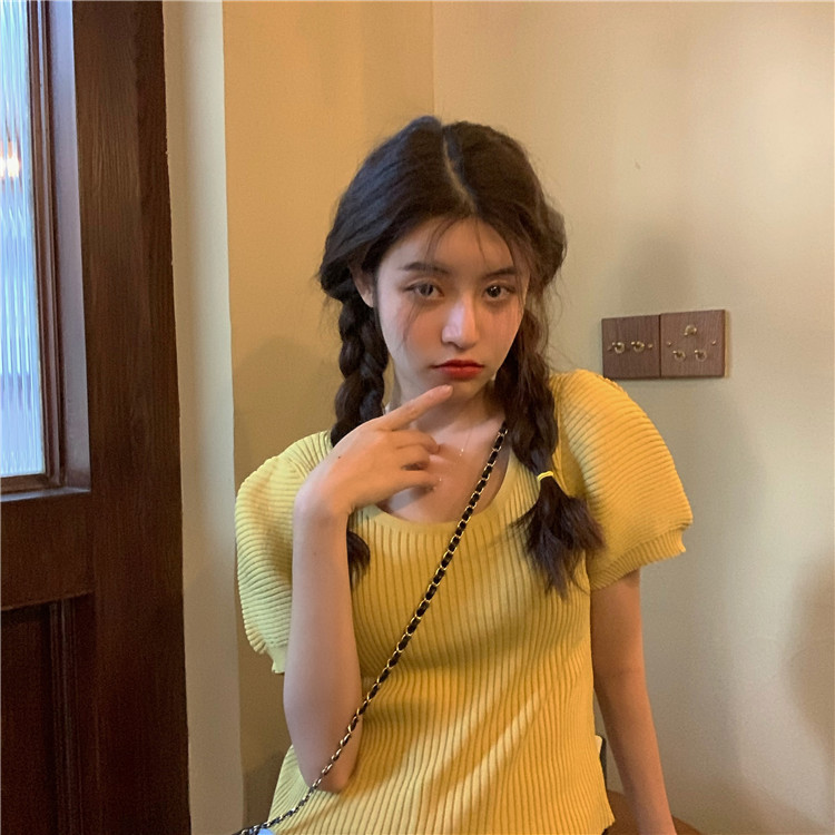 Uveng Uveng New Chic Temperament Slimming Foam Sleeve Round Collar Knitted Short-Sleeved T-Shirt White Blouse Tide