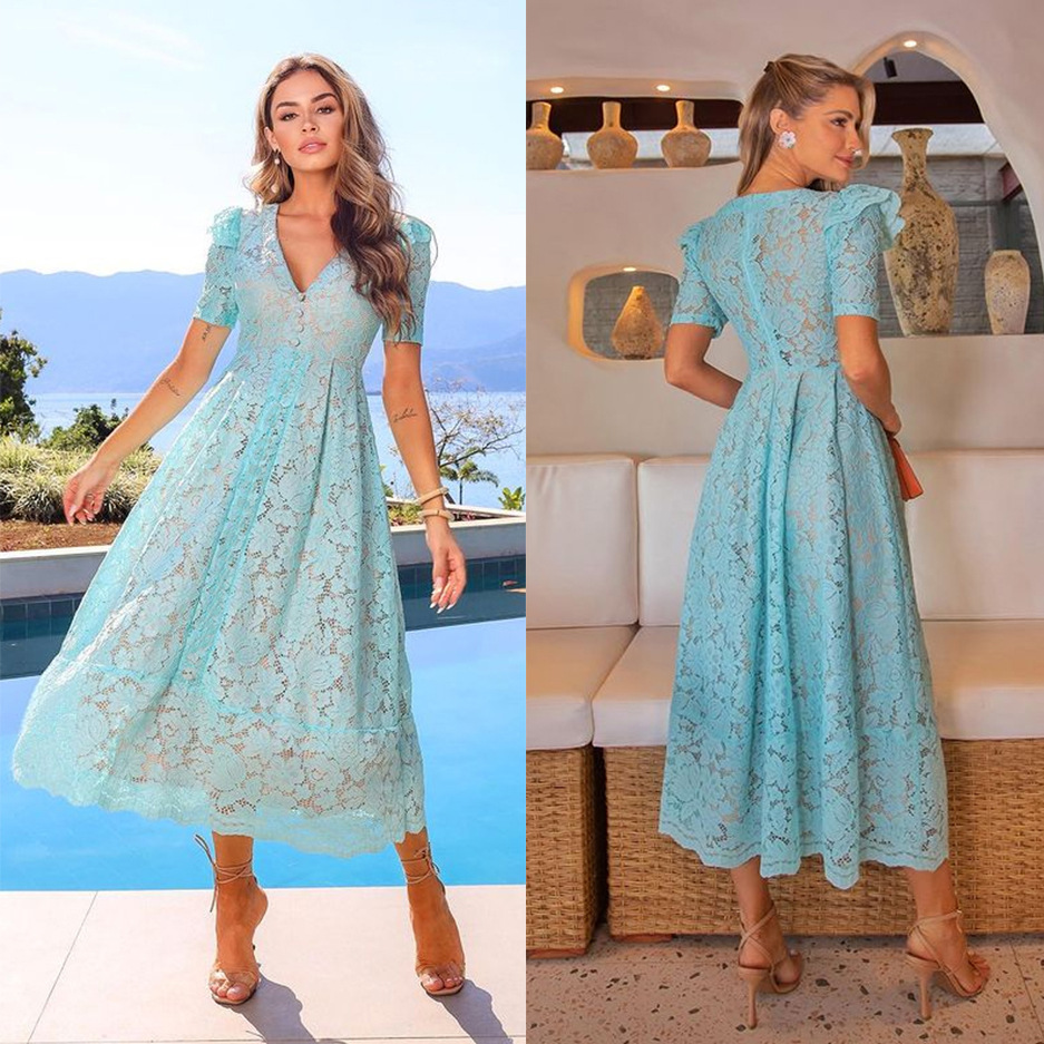 Uveng Uveng New Dress Spring Lace Mid-Swear Temper Commuting High-Waisted Green V-Neck Dress