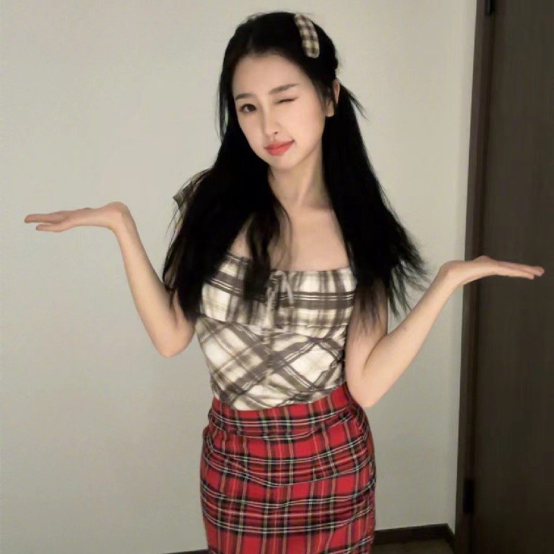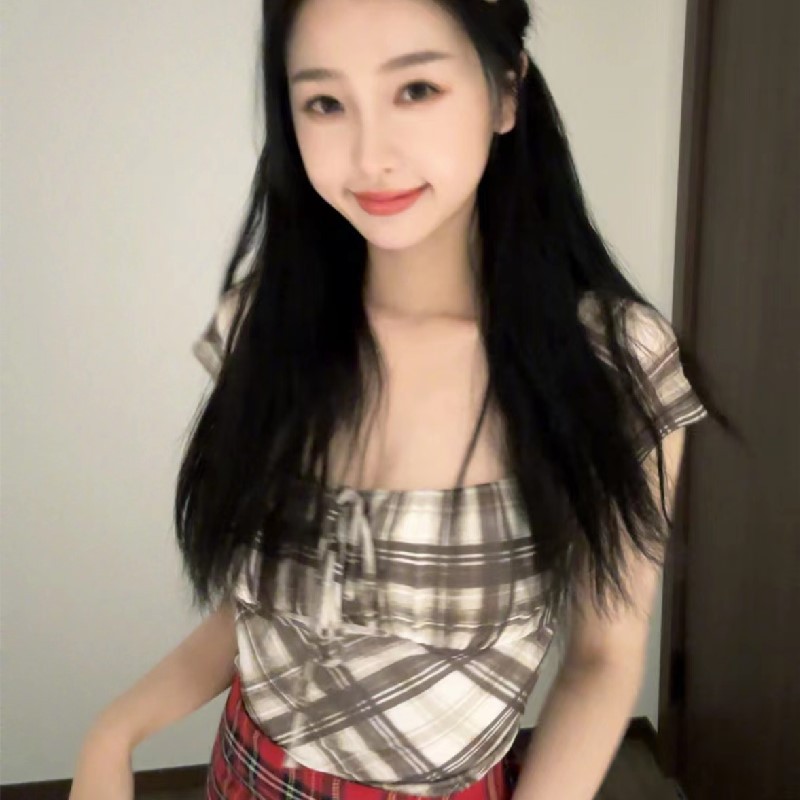 Uveng Uveng New Sexy Hot Girl Pleated Lace Bump Color Plaid Square Collar Slim Short-Sleeved T-Shirt Top