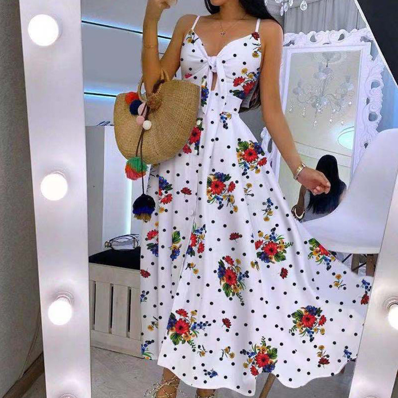 Uveng Uveng New V-Neck Sling Print Commuting Bow Mid-Long Dress