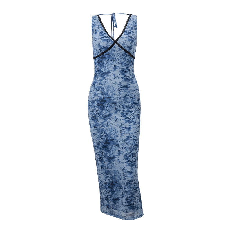 Uveng Uveng New Women's Fashion Retro Print Sexy Back Strap Slim Hip Dress