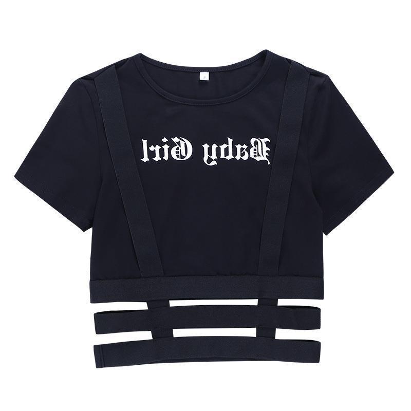 Uveng Uveng Sexy Slim Short Sleeve Letter Print T-Shirt Irregular Hollow Out Crop Bottom Top