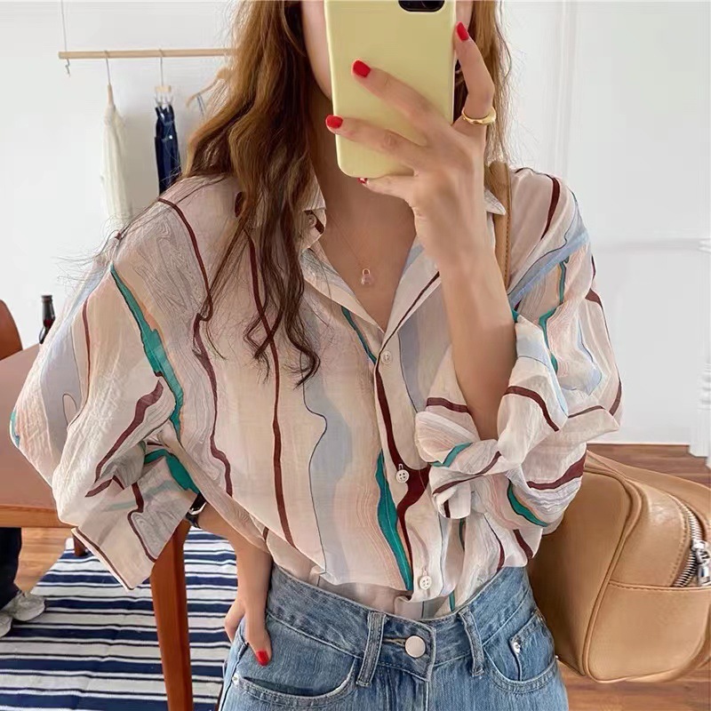 Uveng Uveng Shirt Woman New Korean Ins Folded Striped Loose Long-Sleeved Shirt Top Female Thin