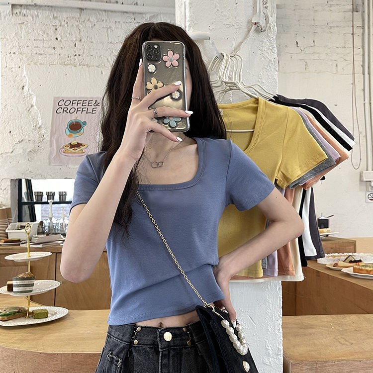 Uveng Uveng Short T-Shirt Female Solid Color 2024 New High Waist Slim Show Thin Hot Girl All-Match Short-Sleeved Square Collar Top Tide
