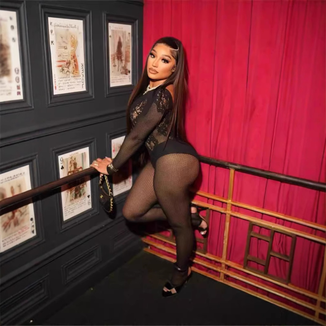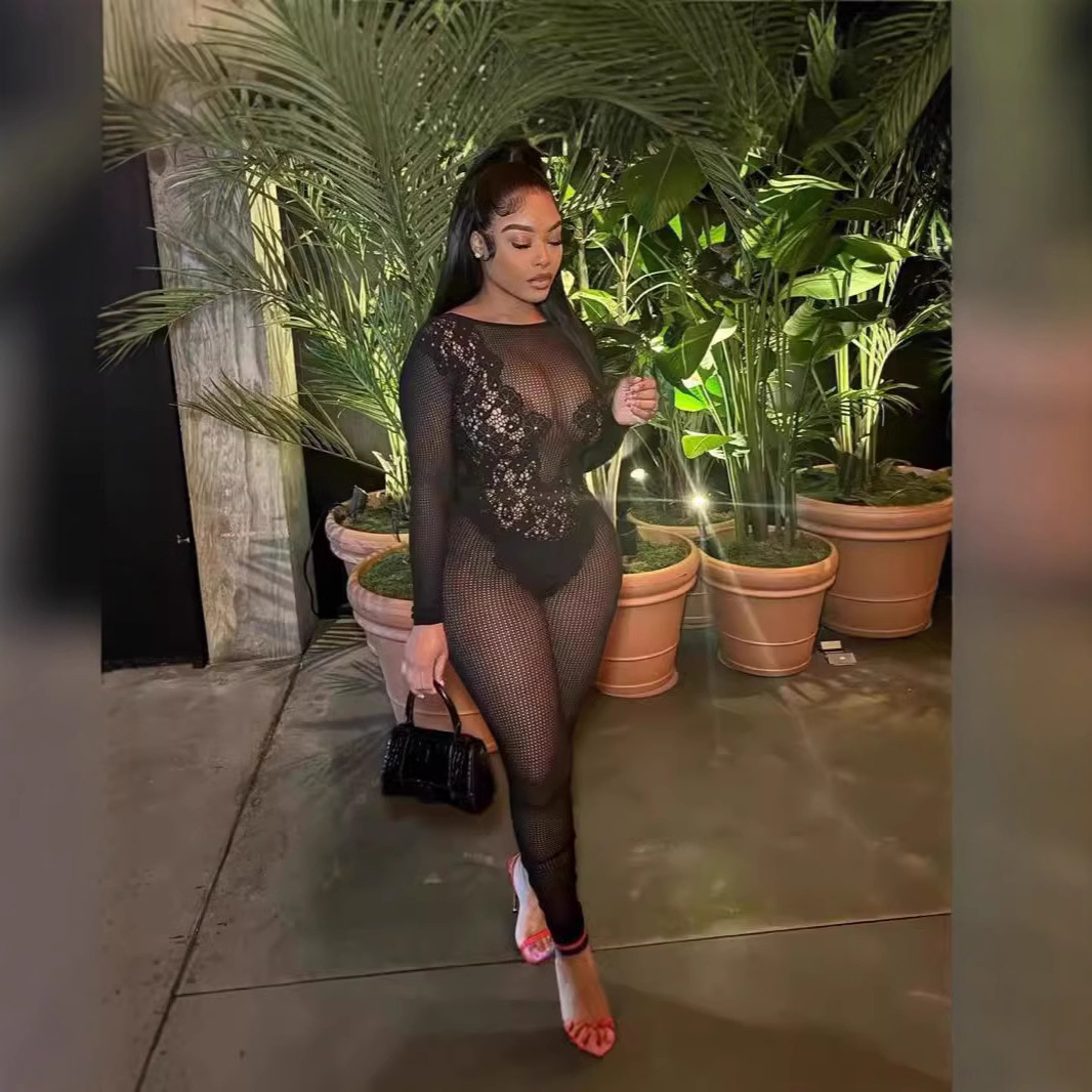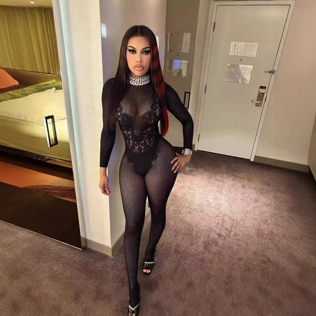 Uveng Uveng Solid-Color Round-Necked Bareback-Repair Sexy Perspective Long-Sleeved Knitting Trousers